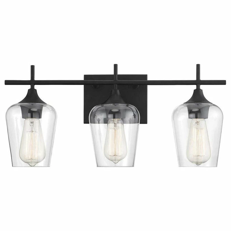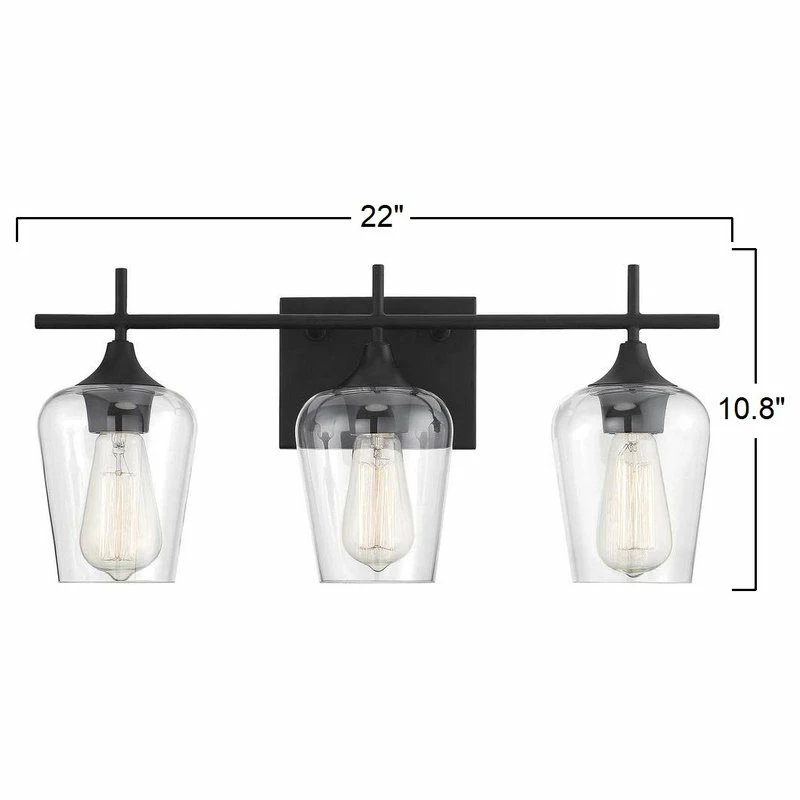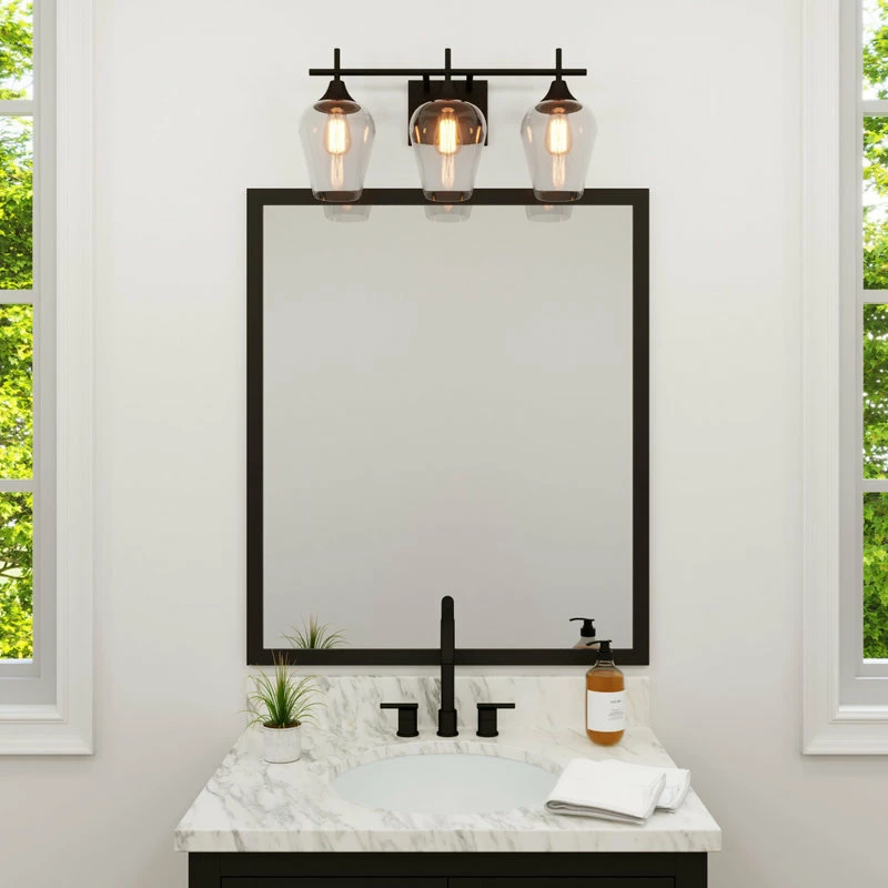 Constructed from durable steel in a chic black finish with three clear glass shades that resemble wine glasses, this vanity light combines simple elegance with contemporary elements to blend with any style including modern farmhouse, coastal, industrial, vintage, and everything in between.