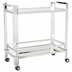 The Lakelyn Serving Cart moves the party with you with its wheels. Bring contemporary charm from the kitchen to your living room with a rose gold finish and mirrored shelf. With this cart, you’ll be organized when social hour rolls around.