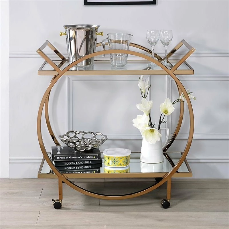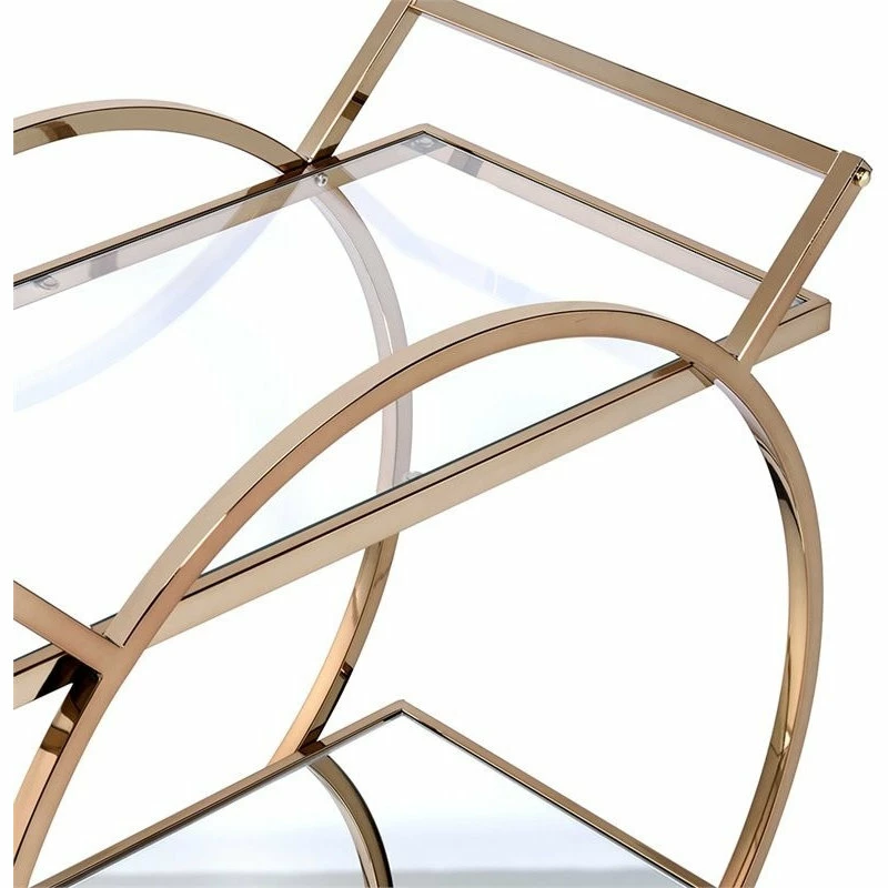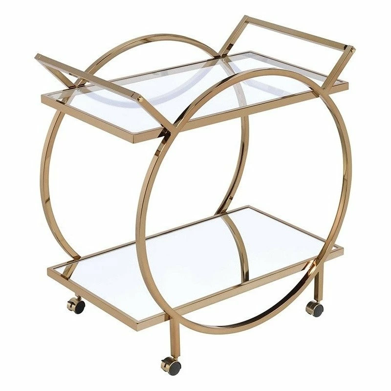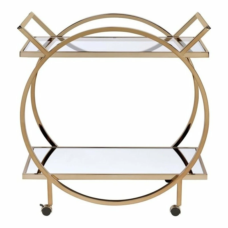 Roll out an artful decor anywhere in your home with this Traverse serving cart. Crafted with quality metal tube, the beautiful frame is finished in elegant champagne. With the glass top shelf and mirrored bottom shelf, its timeless design will conjure up the entire atmosphere. Top it off with trays of delicious pastries and a pitcher of fruity sangria for a tasty treat at your next festive get-together or simply display few glittering jewelry trees to complement your master suite vanity; it is destined to be your favorite piece.