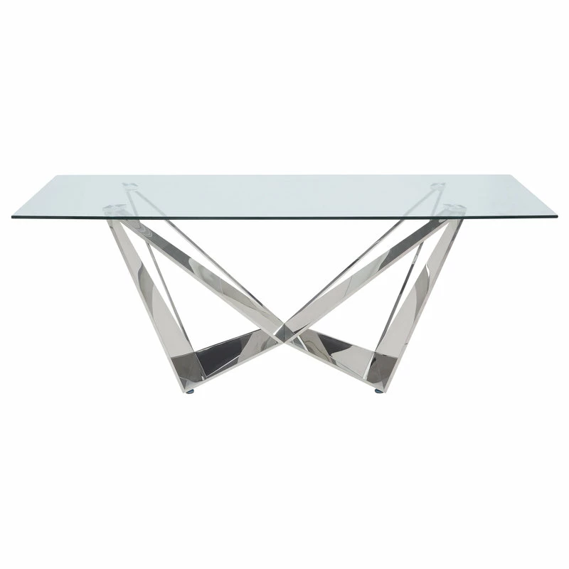 The Dekel dining set brings a modern twist to classic Hollywood glamor with glimmering glass and stainless steel. The unique angles of the dining table’s metal base contrasts beautifully with the soft upholstery of the side chairs, which feature seat backs with button-tufting and decorative metal rings. Vintage glam style is easy to achieve with the Dekel dining set.