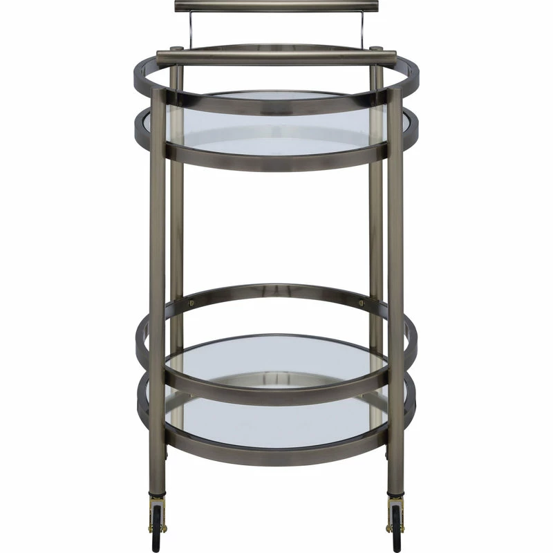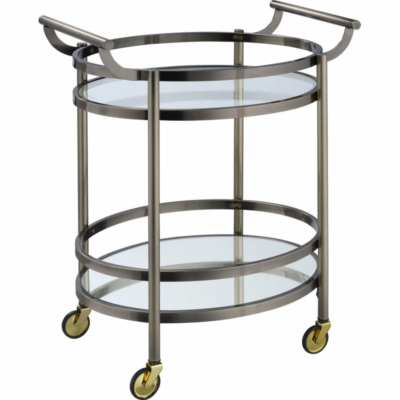 Show off your personality with the Lakelyn serving cart, featuring a metal frame finished in black nickel and top tray of glass and lower mirrored shelf for that glam appeal. The clear tempered glass top and mirror bottom are the ideal place for placing your dishes and dining accessories. Roll it where need be on its softer rubber wheels and prepare to entertain.