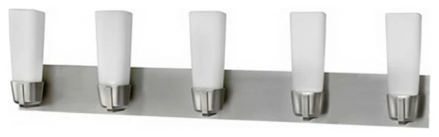 Hand-blown cased frosted white glass set in a contemporary die-cast housing. Satin nickel finish. This light takes 5-4 Watt LED-Warm White 2700k, 200Lumens. **bulbs included**