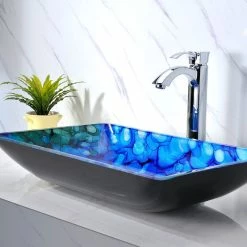 Swiss Madison Cascade Rectangular Glass Vessel Sink With Faucet, Ocean Blue