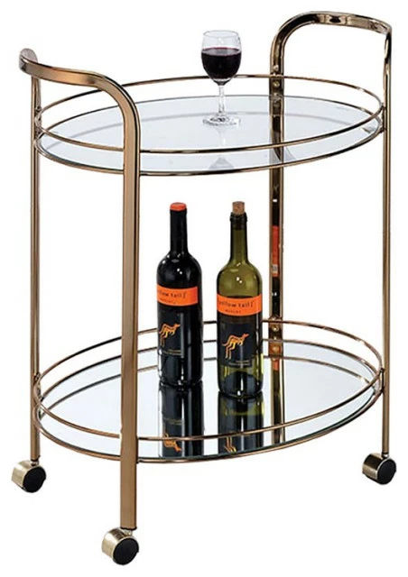 Serve your guests snacks and beverages easily and conveniently with the help of this amazing oval shaped serving cart. Constructed from metal in a gold finish, it features two 5mm tempered glass shelves and raised handles for access. It is supported by caster wheels, providing easy mobility.