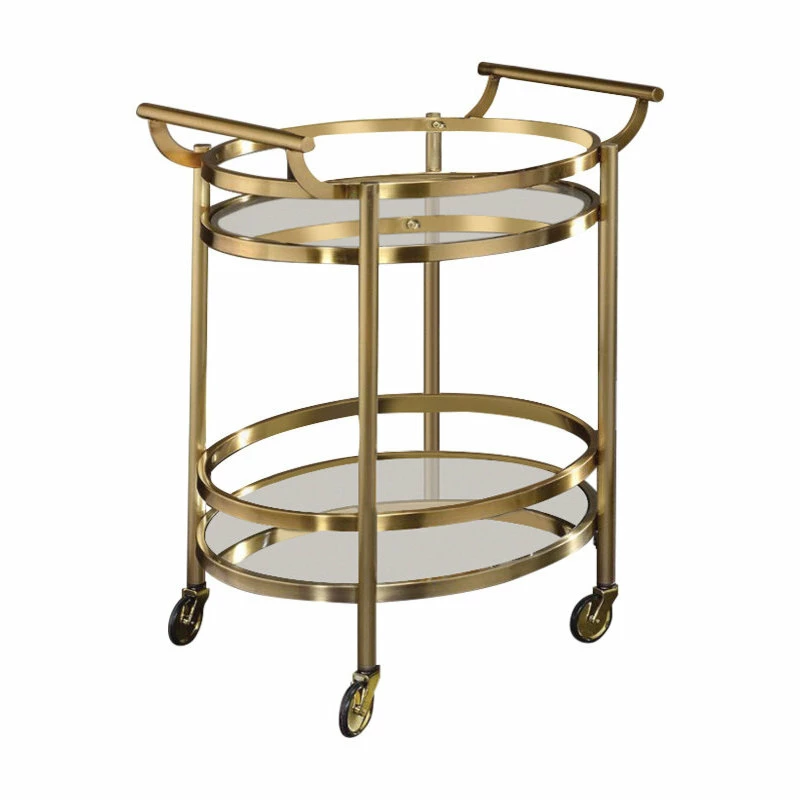 Show off your personality with this serving cart, featuring a metal frame finished in gold and top tray of glass and lower mirrored shelf for that glam appeal. The clear tempered glass top and mirror bottom are the ideal place for placing your dishes and dining accessories. Roll it where need be on its softer rubber wheels and prepare to entertain.