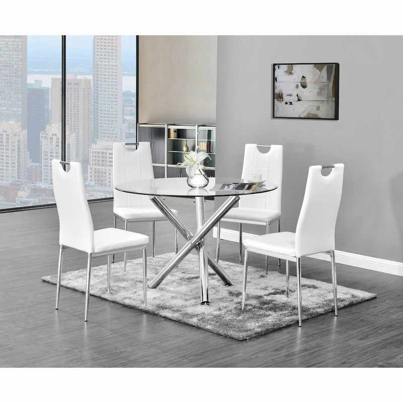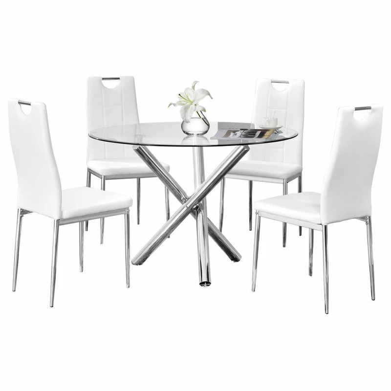 Minimalist. Simple. Modern. If you want a more simple style in your home that won’t take up too much space, this 43 inch round glass dining table is perfect and easy to match with any leather or fabric chairs. The table top is 43 x 43 and the glass in 1/2 inch thick. Legs are made of chrome in a silver color. Chairs are upholstered in faux leather and legs are made of chrome. The table can fit up to four chairs.