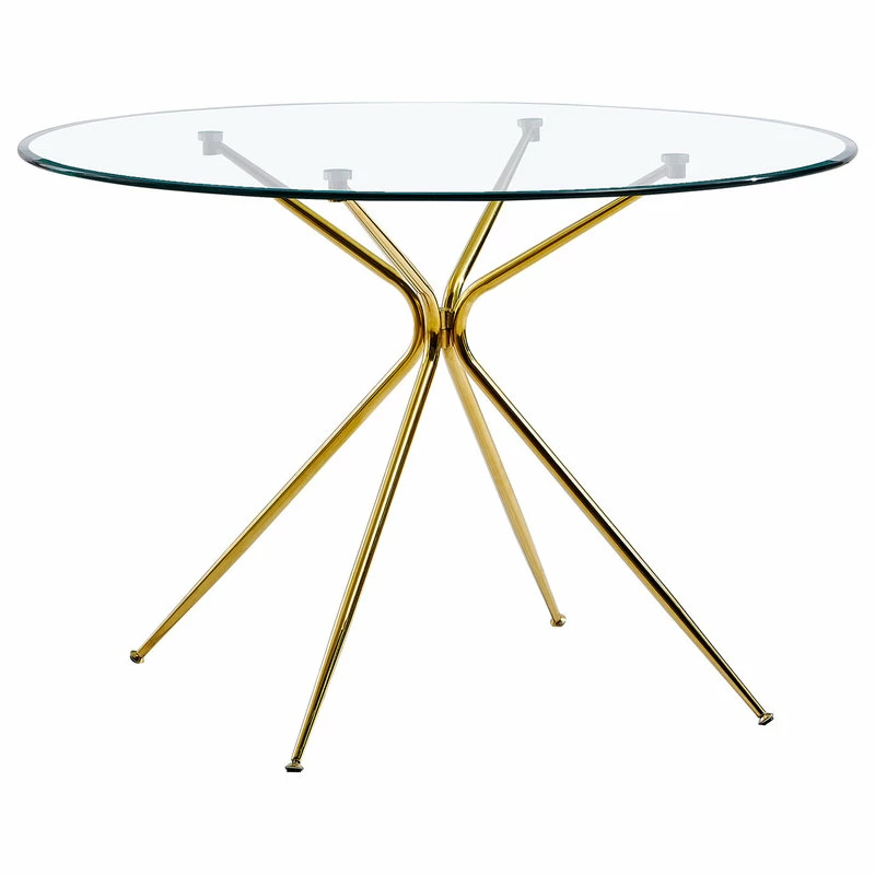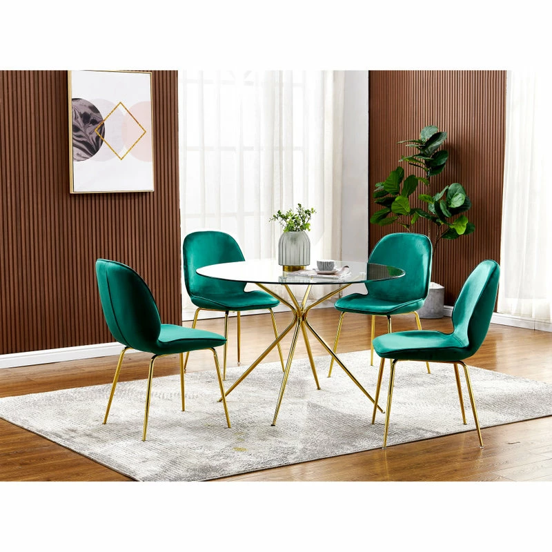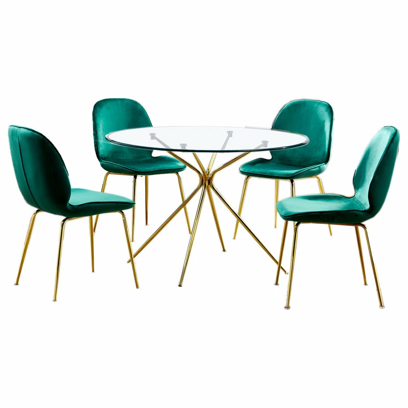 This 5-piece dinette set is quintessential to any glam or modern decor floor plan. Table top is made out of reinforced tempered glass for durability and safety. The upholstery is made out of premium velvet fabric. The base of the chair is gold plated stainless steel. Chair also have plastic floor protectors to keep your floor safe!