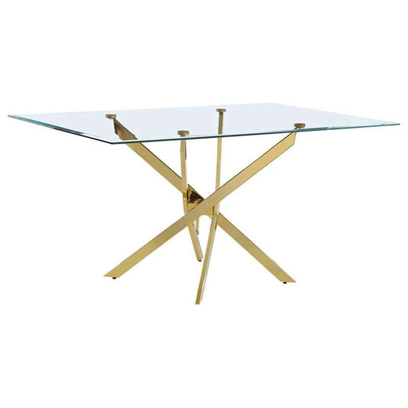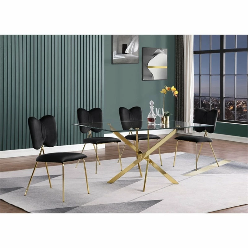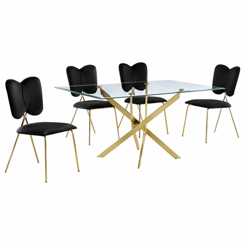 A contemporary 5 piece dining set that’s perfect for any home. This set includes a clear glass table and 4 velvet chairs, each with a gold chrome base. The table top is 10mm tempered glass with a 25mm beveled edge. The chairs are available in colors: Dark Gray, Navy Blue, Black, Cream, and Pink.