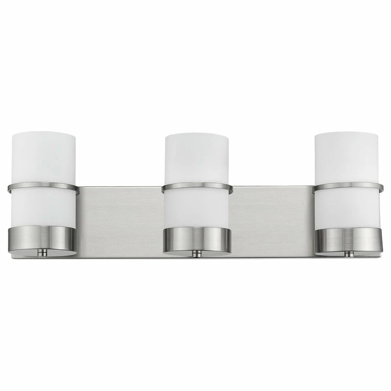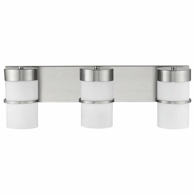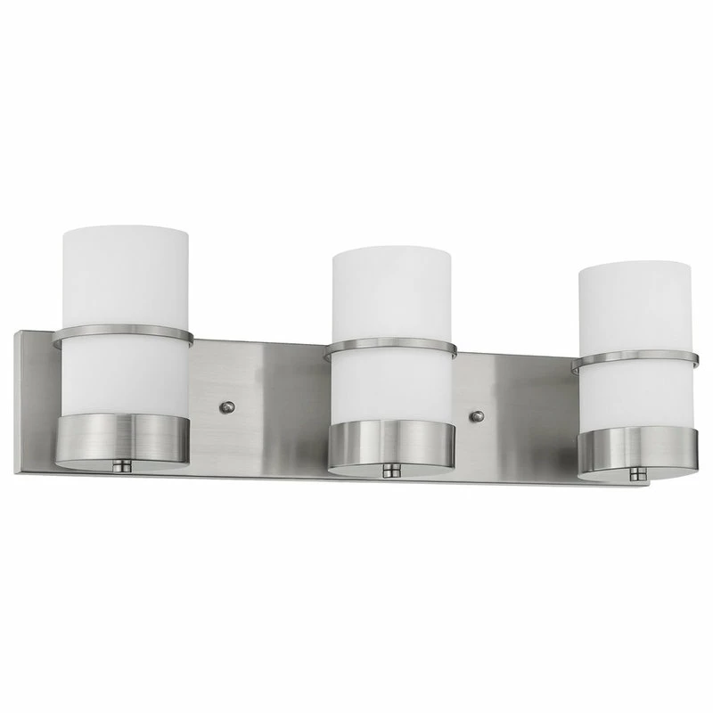 This 3-light bath/vanity fixture features a brushed nickel finish that will complement many transitional decors. The clean lines of the steel frame add interest while the etched white cylinder glass shades soften the light to create a warm ambiance for any space.