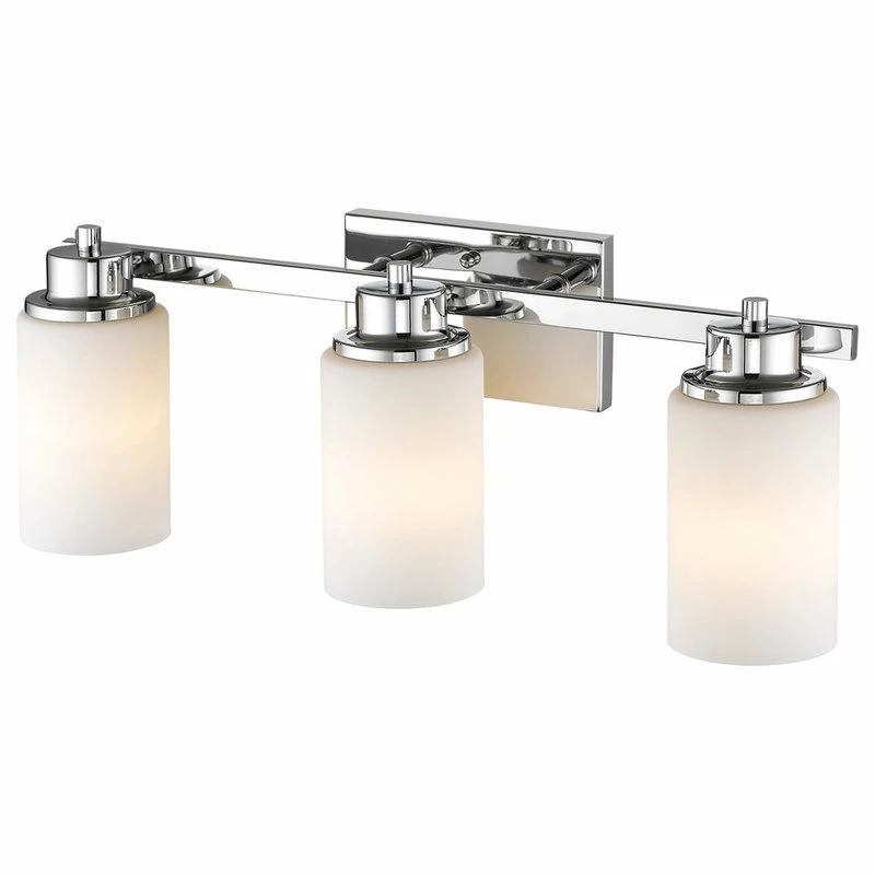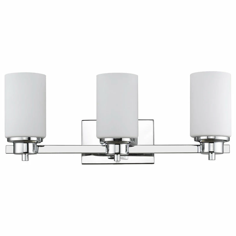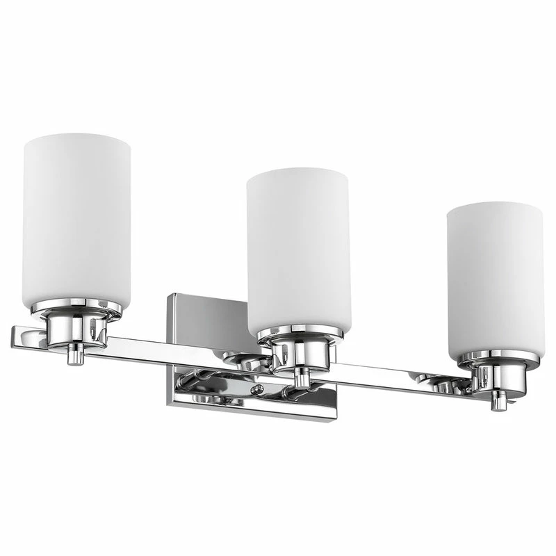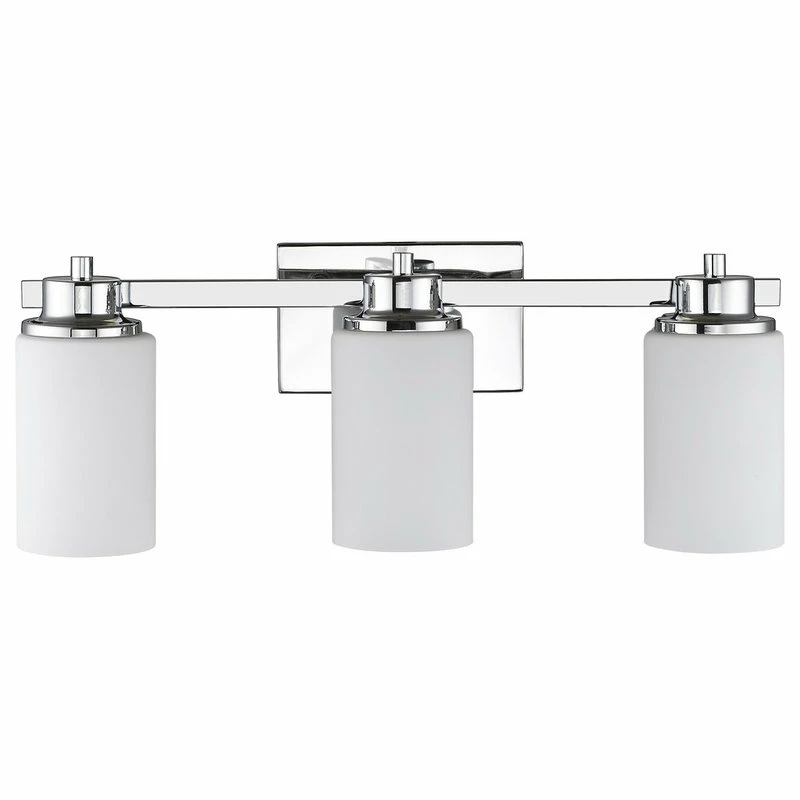 This 3-light bath/vanity fixture features a chrome finish that will complement many transitional decors. The clean lines of the steel frame add interest while the etched white cylinder glass shades soften the light to create a warm ambiance for any space.