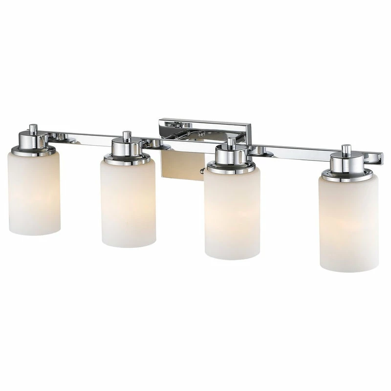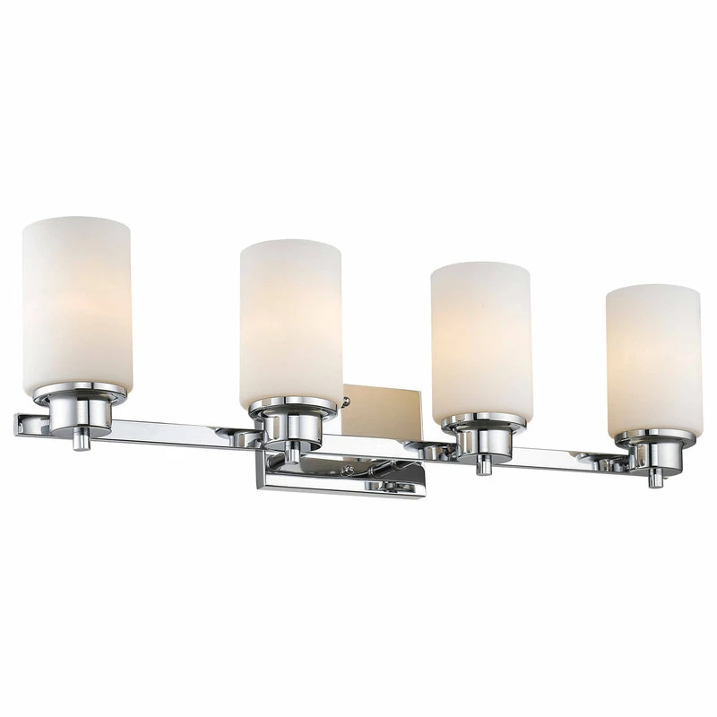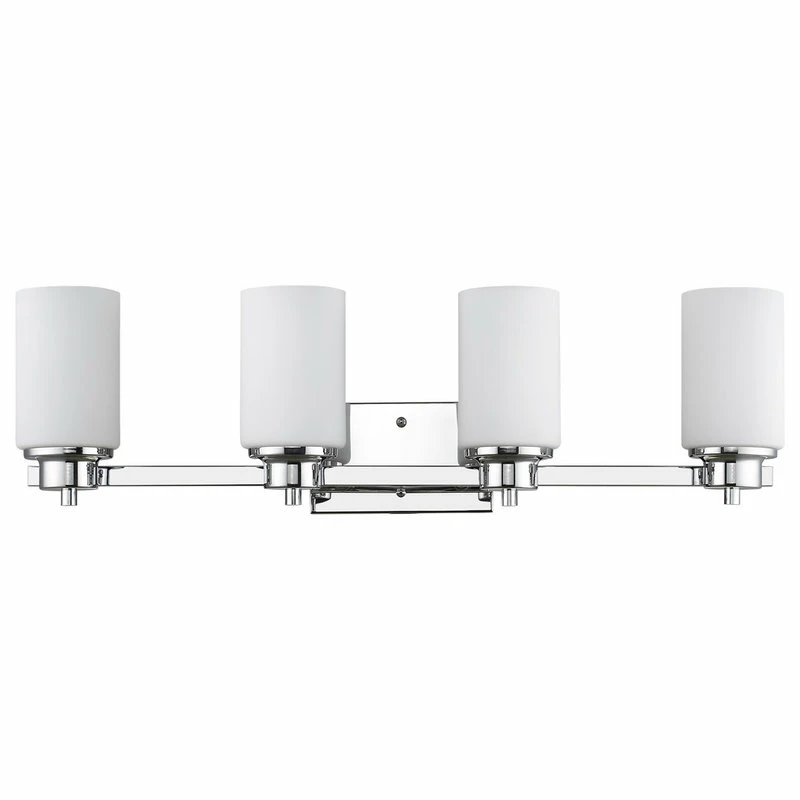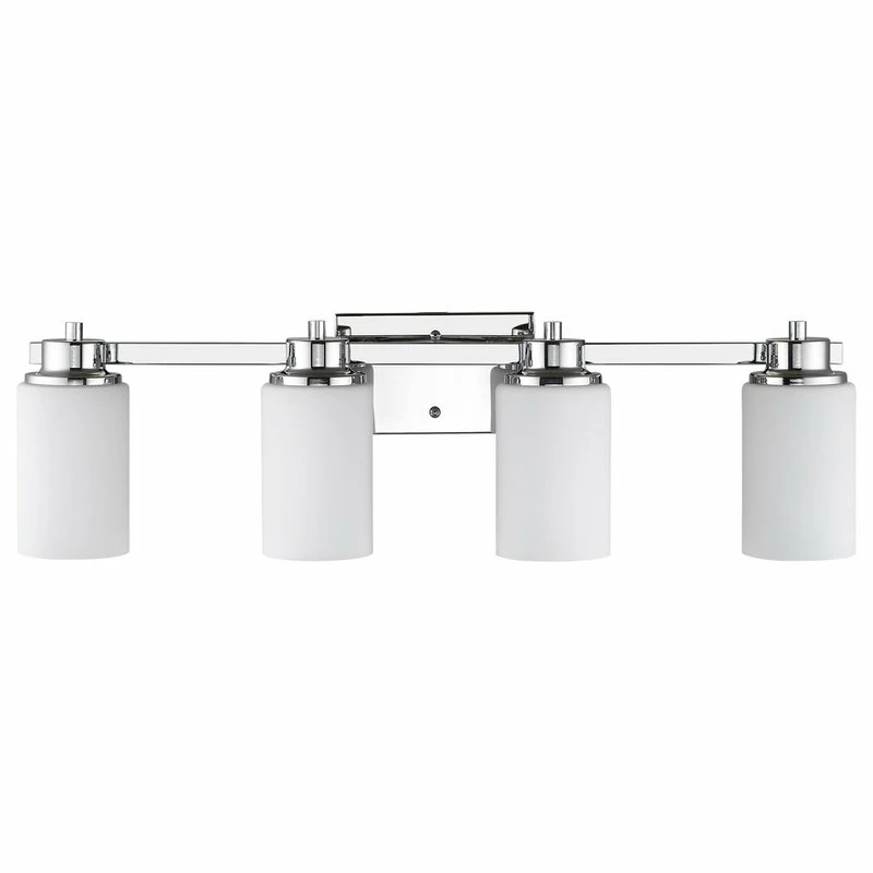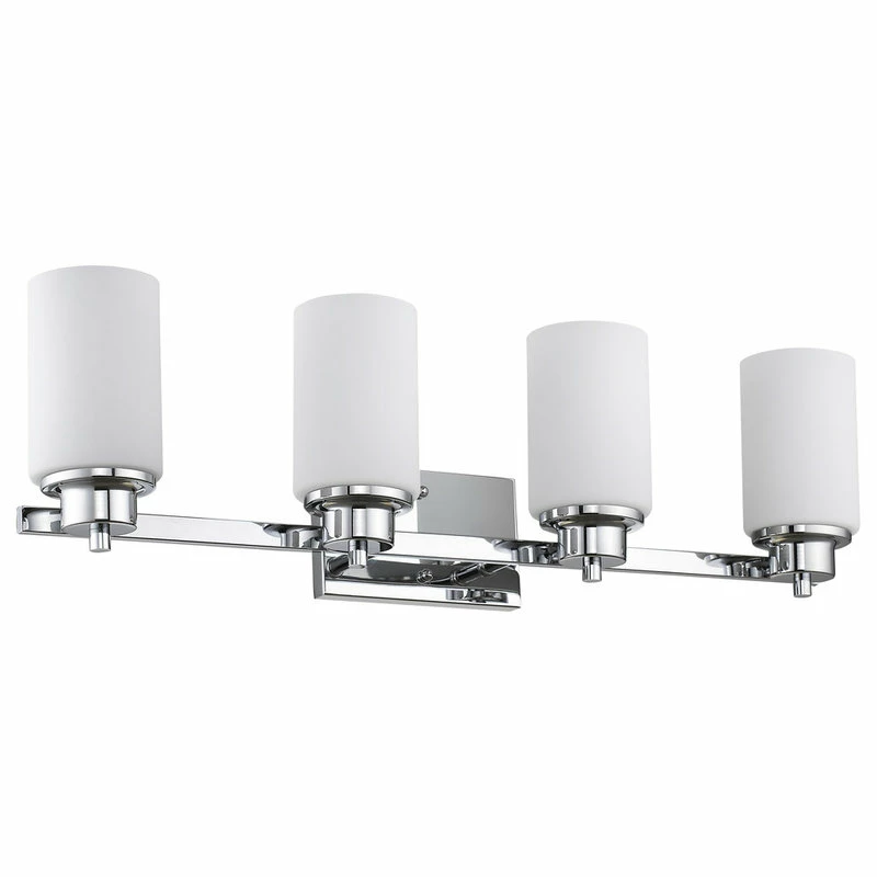 This 4-light bath/vanity fixture features a chrome finish that will complement many transitional decors. The clean lines of the steel frame add interest while the etched white cylinder glass shades soften the light to create a warm ambiance for any space.