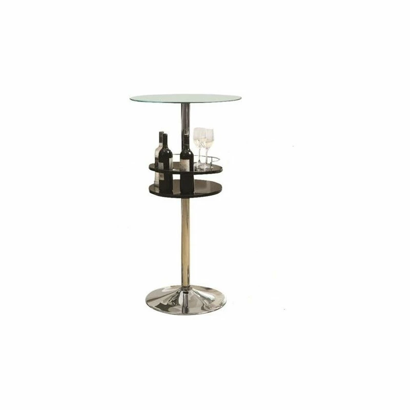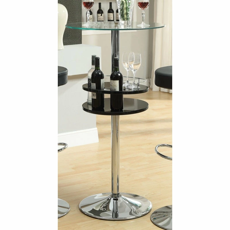 Featuring a built-in wine and stemware shelf, this contemporary bar table is perfect for compact spaces. Delivering modern style, the table features a round tempered glass table top perfect for indulging in a cocktail or serving up a great glass of wine. Underneath, its wine and glassware storage shelf is crafted with two layers of black glass that draw the eye. The table rests atop a pedestal base with a round foot and gleaming chrome finish. Measuring just under 24″ across, this bar table fits virtually anywhere.