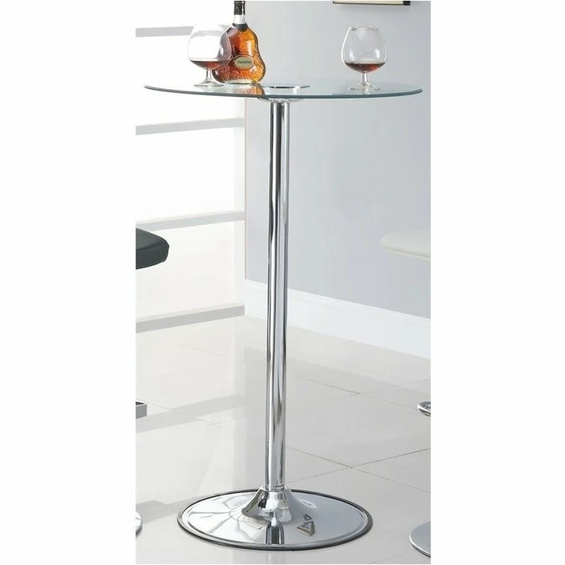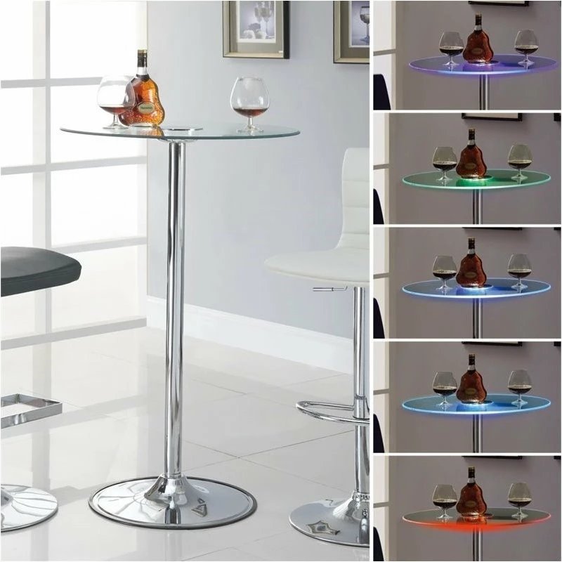 Modern appeal is evident in each and every contour of this contemporary bar table. Its pedestal base boasts a gleaming chrome finish and rounded foot. A petite tempered glass table top is clear, adding to a clean, minimalist presentation. The glass table top is further adorned with transitioning LED lights. Perfect for a compact breakfast nook or a happening home lounge.