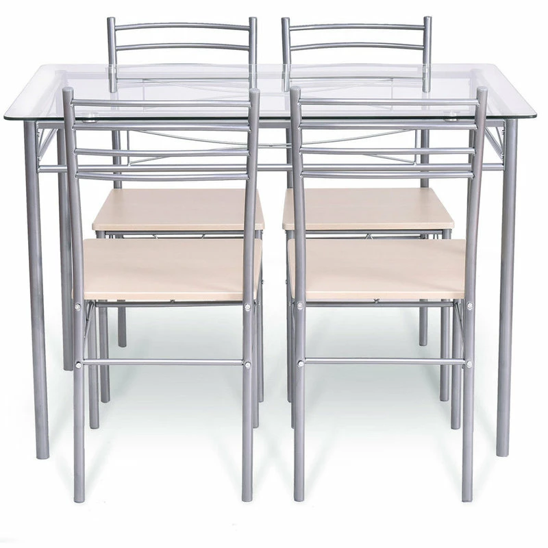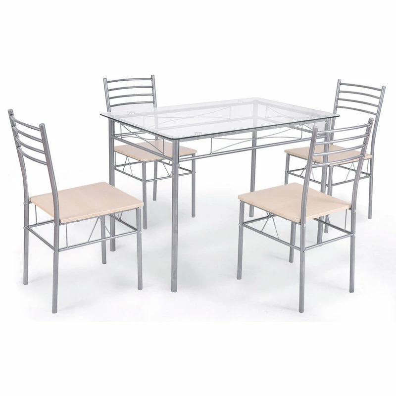 Our kitchen table and chairs set is bright in color, smooth in line, and simple in design to attract your attention. Simple and delicate is our goal. Combination of transparent glass desktop, wood color seat and silver frame, you can enjoy a simple lifestyle in a comfortable and free atmosphere. It’s also useful at home. It can be placed not only in the kitchen, but also in the dining room. If the weather permits, you can also move it to the yard to spend your leisure time. You don’t have to worry about its quality. It’s made of toughened glass and rounded corners are designed to protect your children from collision. In addition, tables can be easily moved and cleaned.