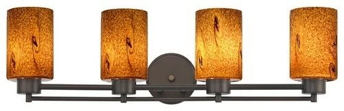 Modern neuvelle bronze 4-light bathroom light with cylinder glass shades. Takes four 100-watt medium base frosted light bulbs (not included). Suitable for installation in dry and damp locations. This bathroom light can be installed with the glass facing up or down. A socket ring may be required if installed facing down