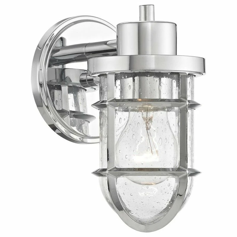 Marine/nautical style polished chrome 1-light outdoor wall light with seeded clear glass shade. Takes one 60-watt medium base light bulb (not included). This finish is rated for installation in damp and dry locations. The bronze version of this fixture is rated for wet locations. UL and CUL certified. 120 volts line voltage. Can be installed with shade facing down only.