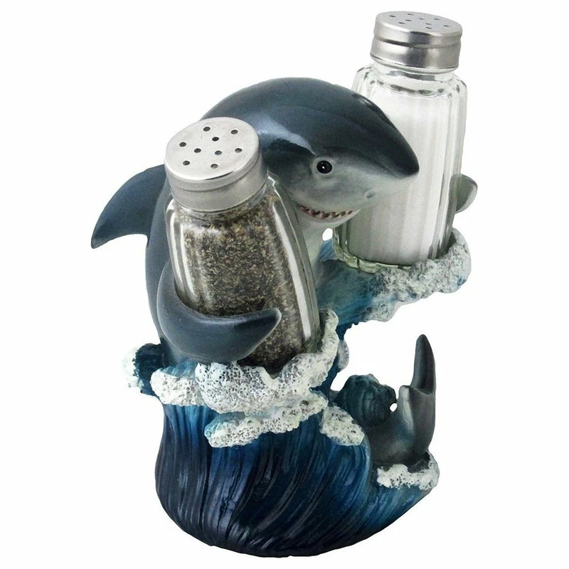 With an action pose and strikingly realistic coloring, this mighty shark salt and pepper shaker set is an awe-inspiring sight to behold! But don’t be afraid, as this fellow is just here to add deep sea drama to your kitchen decor. Remarkably detailed from nose to tailfin, this handsome ocean creature is one seriously smart piece of sculpture. It looks great in the fanciest or saltiest of establishments! Makes a great Christmas gift for any collector of nautical or tropical decor.