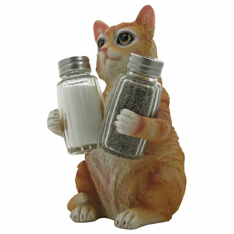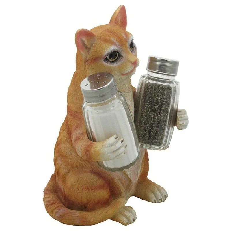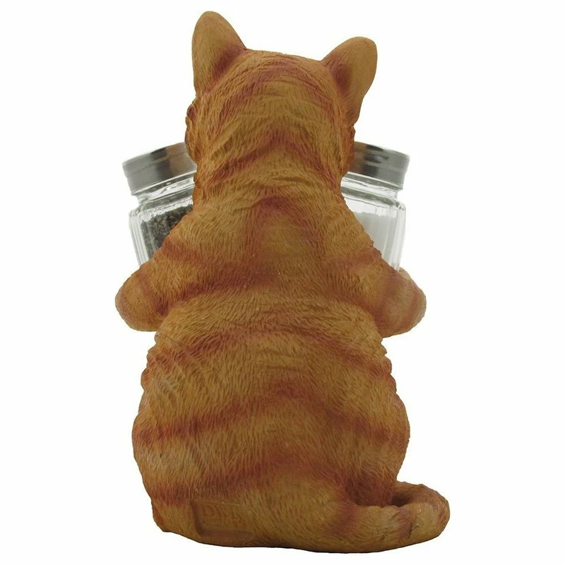 How could anyone possibly resist this charming tabby kitty cat figurine holding a set of salt and pepper shakers? This adorable kitten is certain to add a bit of cheer to each meal, while helping to keep your seasonings within easy reach. What a smart way to decorate your dining room table! This orange tabby cat figurine makes a great gift for cat owners or anyone who collects pet decor. This set of three pieces includes one cat sculpture salt & pepper holder and two glass s and p shakers.