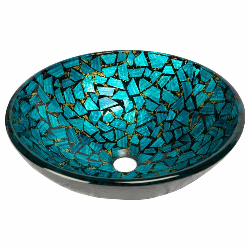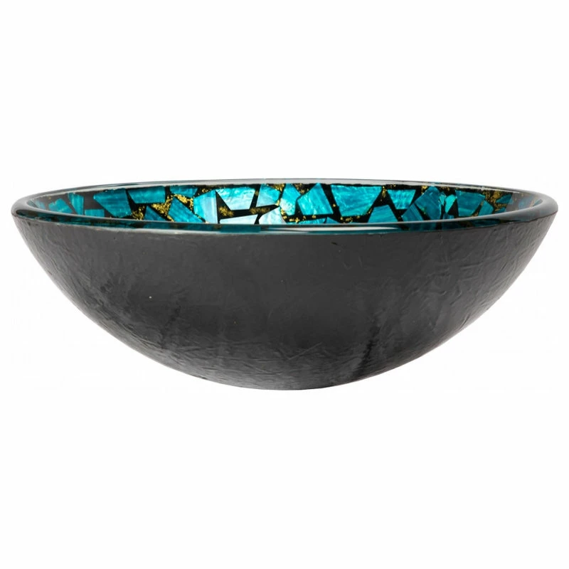 The Eden Bath Blue and Gold Mosaic Round Tempered Glass Vessel Sink features a round shape with a black painted, textured exterior with pieces of blue foil surrounded by black and gold throughout the bowl. Each glass vessel sink is made of high quality tempered glass. We recommend that you also purchase a mounting ring and drain with your glass bathroom sink bowl in the same finish of your faucet.