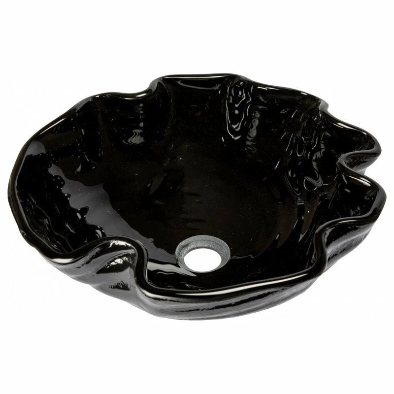 The Eden Bath Midnight Wave Above Counter Round Glass Vessel Sink features a glossy black interior and exterior, making a dramatic statement in any setting. The sink is made of high quality tempered glass and handpainted on the exterior to create depth of color. We recommend that you also purchase a mounting ring and drain with your glass bathroom sink bowl in the same finish of your faucet.