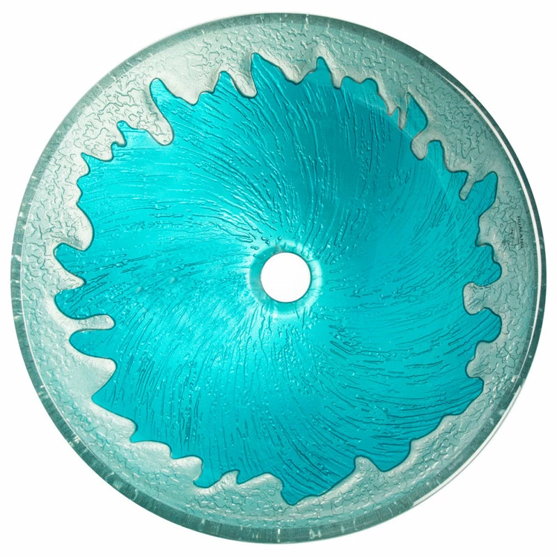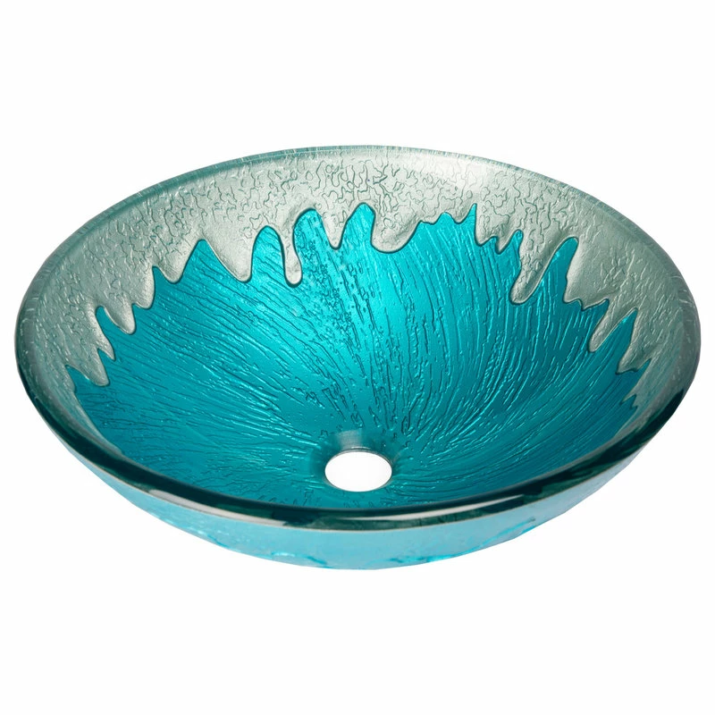 The Eden Bath Blue Ice Above Counter Round Tempered Glass Vessel Sink features turquoise blue and silvery white colors. The white drops from the rim to create a snowy ice appearance. The sink colors come from foils applied and sealed on the exterior of the bowl. Each sink is made of high quality tempered glass. We recommend that you also purchase a mounting ring and drain with your glass sink in the same finish of your faucet.