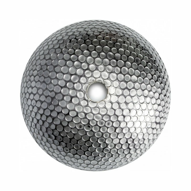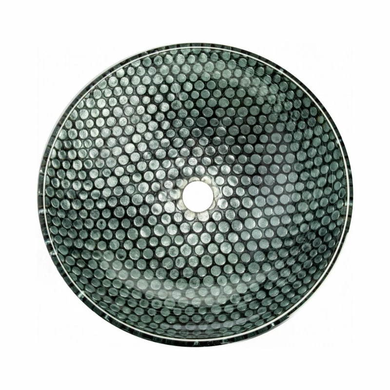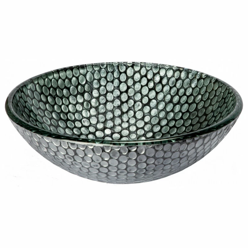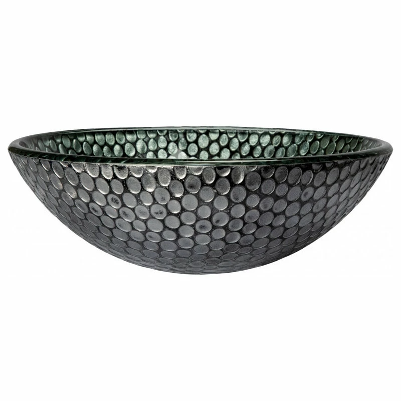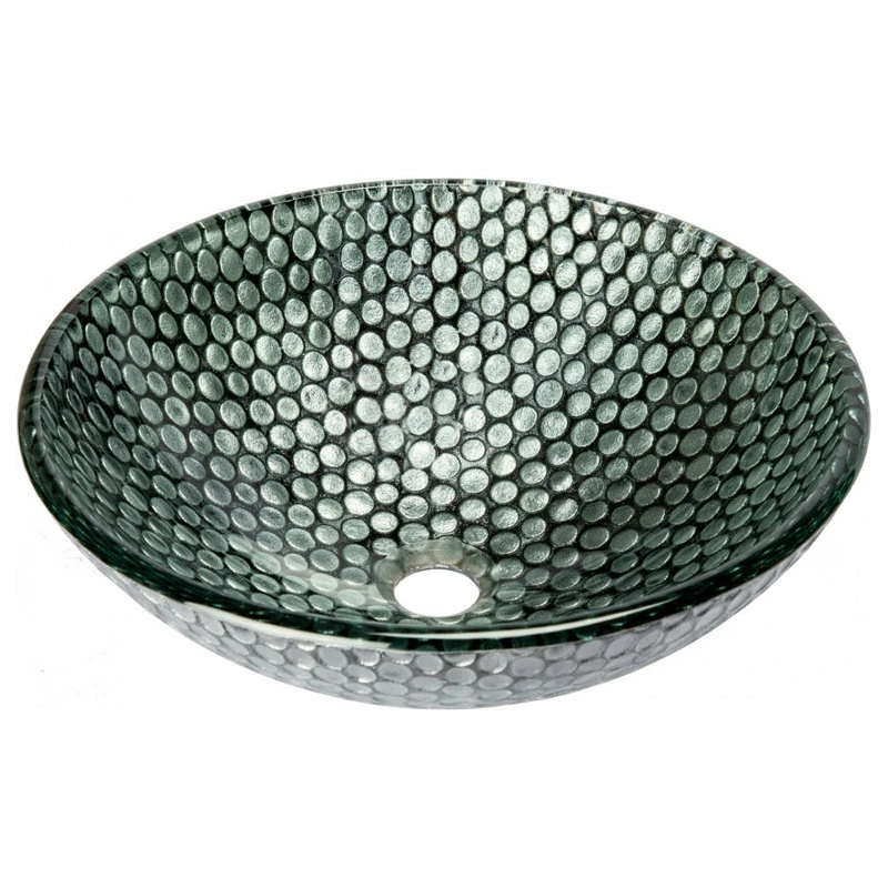 The Eden Bath Silver Dots Glass Vessel Sink features a black and silver pattern of circles. It has a round shape with a smooth interior and the pattern creating a textured exterior. Each glass vessel sink is made of high quality tempered glass. We recommend that you also purchase a mounting ring and drain with your glass bathroom sink bowl in the same finish of your faucet.