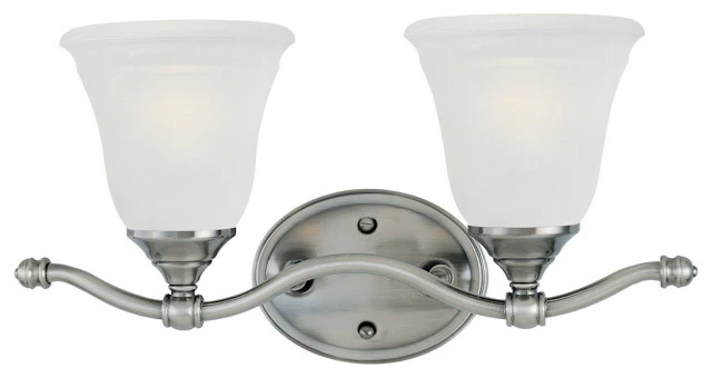 Two light bath bar in satin pewter finish with white marbled glass. Overall dimensions 16W X 8H X 7D. Two light 100 watt medium base incandescent or led equivalent bulb required, not included. Can be hung with glass facing up or down. Hardwired only.