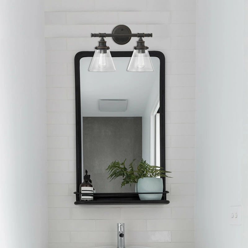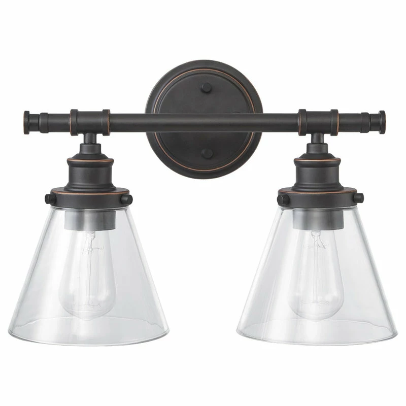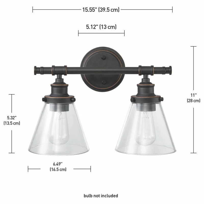 Combining a modern refined vintage look with an industrial pipe look, the Parker 2-Light Vanity Light is an easy way to update your bathroom, kitchen or bedroom. This 2-light fixture has clear glass shades in a vintage bronze finish that complements your existing decor. The clear glass shades bring a refined vintage feel to any space and perfectly showcase a bulb of your choice. With a variety of different medium-based vintage Edison and designer bulbs to choose from, Globe Electric allows you to customize this fixture to suit your individual taste. Couple this with a compatible dimmer switch to create the perfect atmosphere for any mood you’re in (dimmer switch not included).