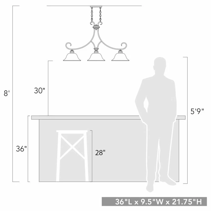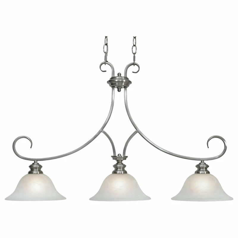 With gentle, sloping lines and diffused warm light, Golden Lighting’s Lancaster collection suits the soft modern or soft traditional home. Squared arms follow subtle curves for a strong contemporary feel of elegance, and the cool Pewter finish adds a nuance of icy sophistication. Marbled Glass completes the look of tasteful elegance. This 3 light linear pendant illuminates a kitchen bar or dining table without interfering with activity on the surface.