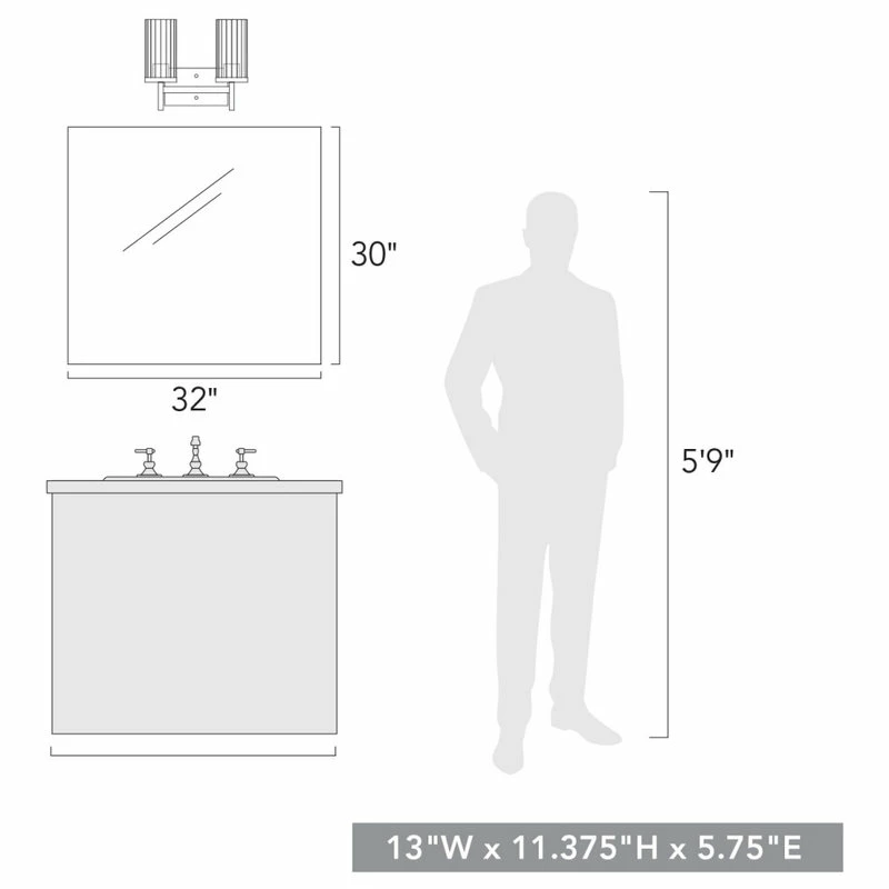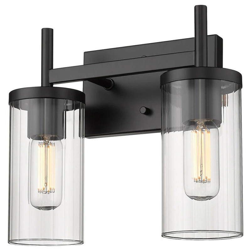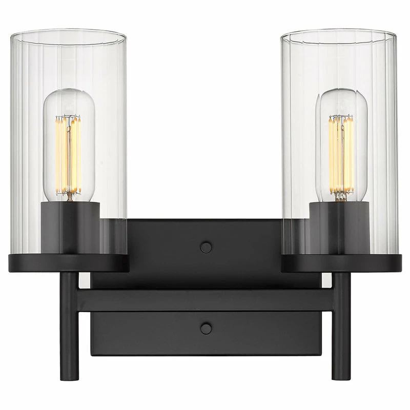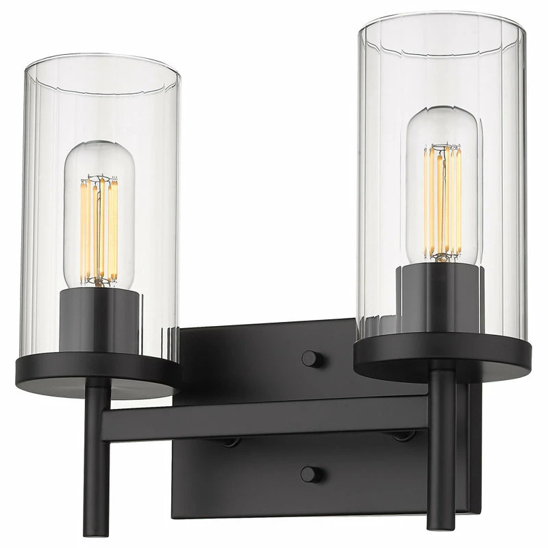 Golden Lighting’s Winslett collection is versatile and transitional in style. Classic silhouettes are perfectly matched with clean, modern lines for a mixture of form and function. Bright bulbs shine within ribbed clear glass shades. The linear texture, made by a glass-blowing technique, creates the optical illusion of distortion. The vertical lines in the glass provide gentle diffusion while playfully refracting light. Offered in two highly adaptable finishes; Pewter and Matte Black, the Winslett collection is suitable for a variety of decors. This 2-light bath vanity is UL approved damp locations.