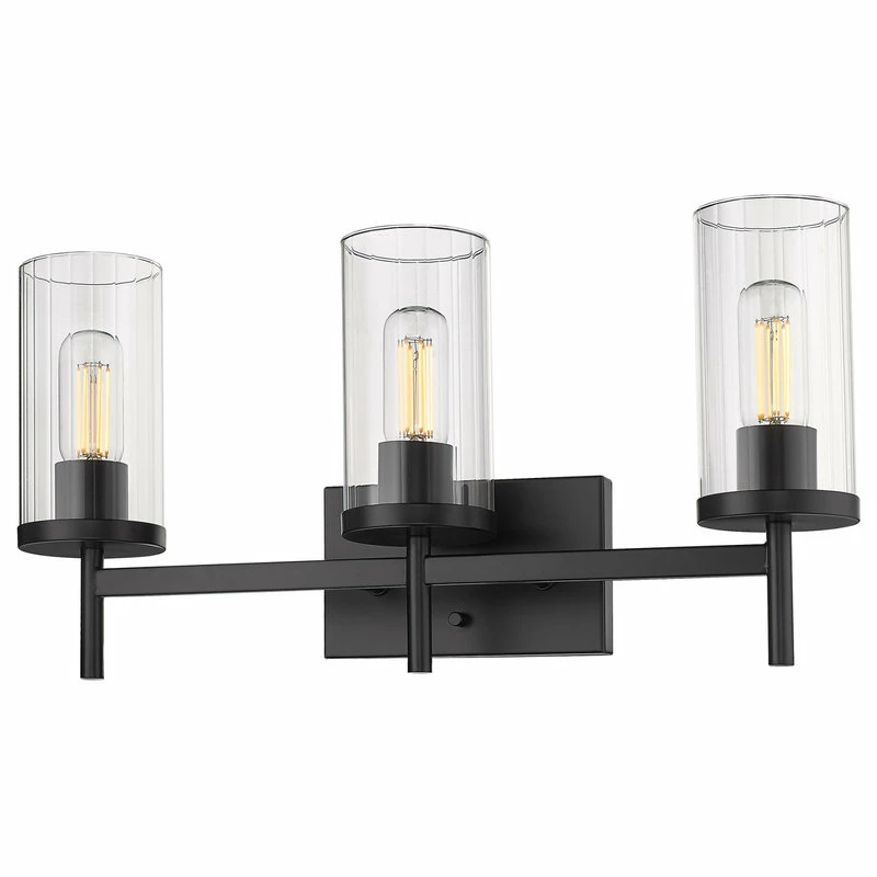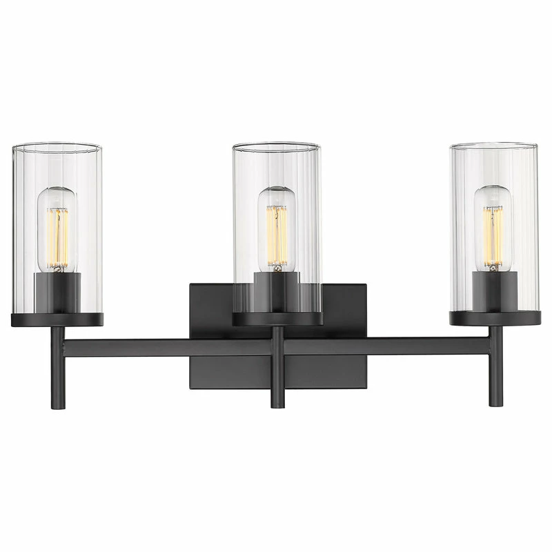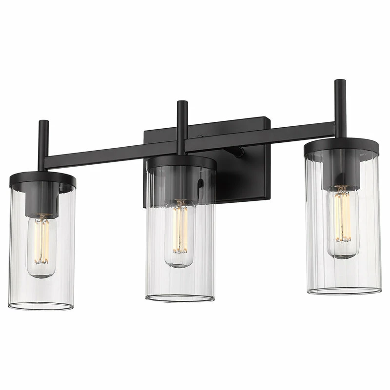 Golden Lighting’s Winslett collection is versatile and transitional in style. Classic silhouettes are perfectly matched with clean, modern lines for a mixture of form and function. Bright bulbs shine within ribbed clear glass shades. The linear texture, made by a glass-blowing technique, creates the optical illusion of distortion. The vertical lines in the glass provide gentle diffusion while playfully refracting light. Offered in two highly adaptable finishes; Pewter and Matte Black, the Winslett collection is suitable for a variety of decors. This 3-light bath vanity is UL approved damp locations.