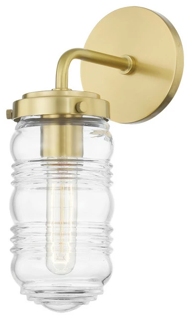 An incandescent bulb is on display inside a glass jar shade in this chic piece. Metal accents at the bulb base, arm, canopy and backplate add a touch of shine. Bath and vanity fixtures feature a beehive-inspired, ribbed glass shade.