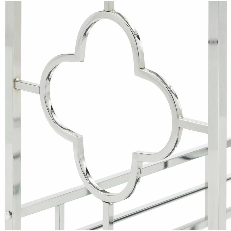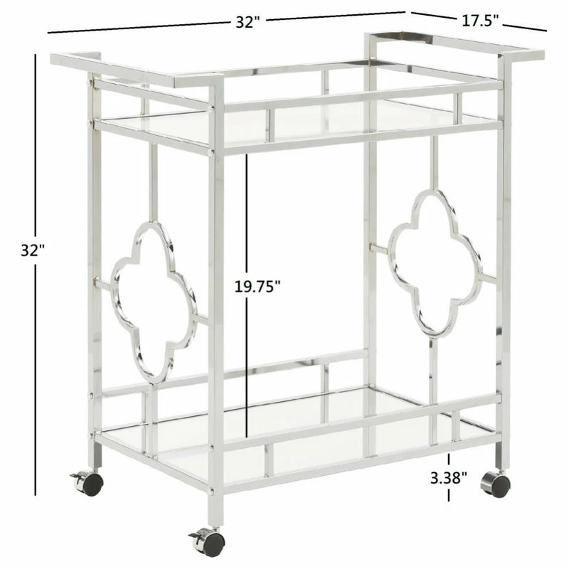 This Chrome Finish Floral Bar Cart with Mirror Bottom and Glass Top is sure to steal the show at your next family gathering. This versatile piece features a shiny chrome metal frame with an eye-catching rounded quatrefoil design. Keep all your bottles and spare glasses on the mirrored bottom shelf. Use the top glass shelf to pour and mix drinks. With locking caster wheels, you can take the party with you wherever you go!