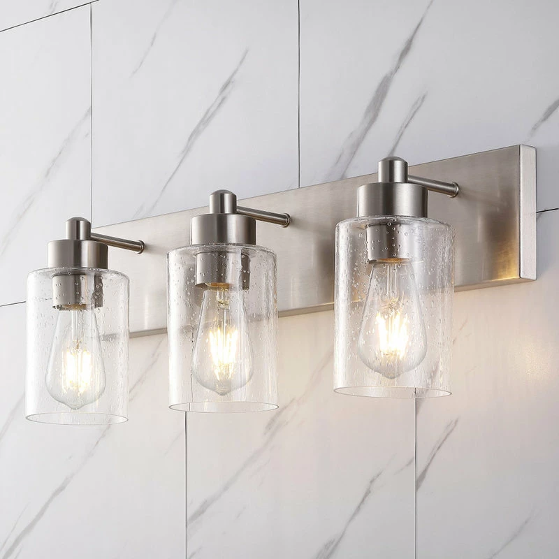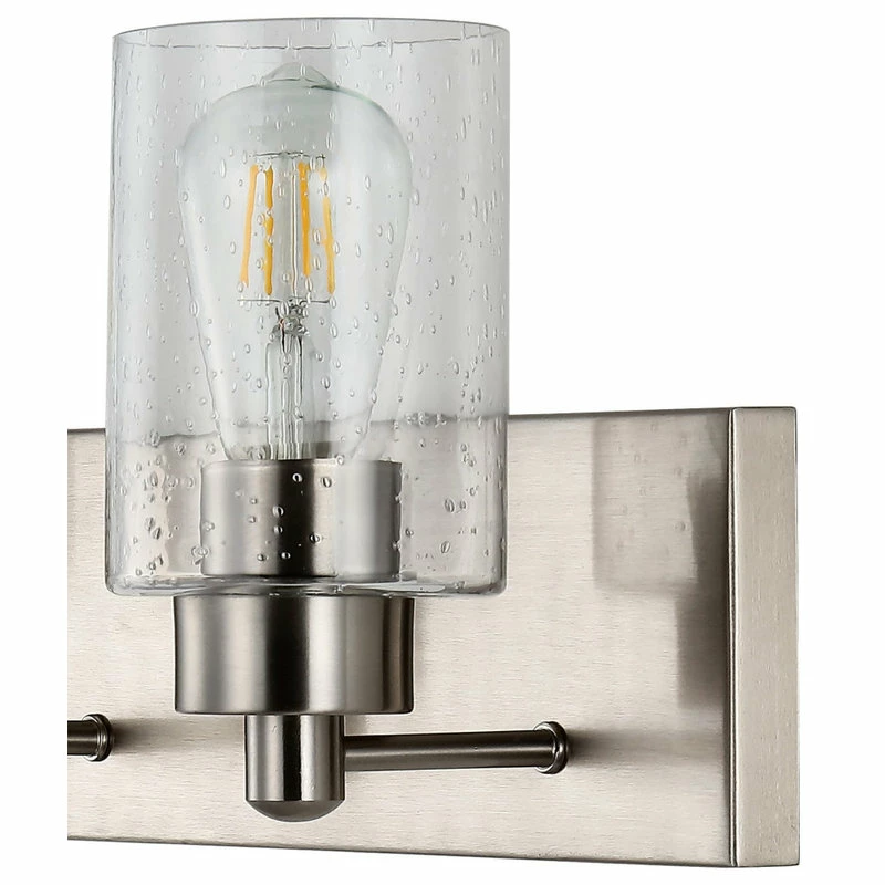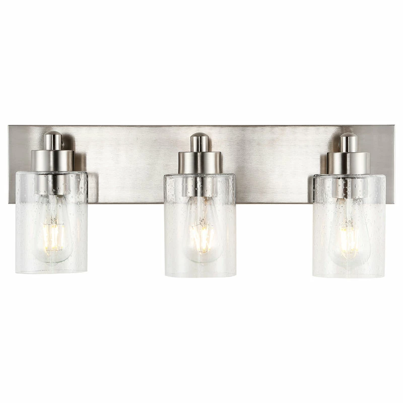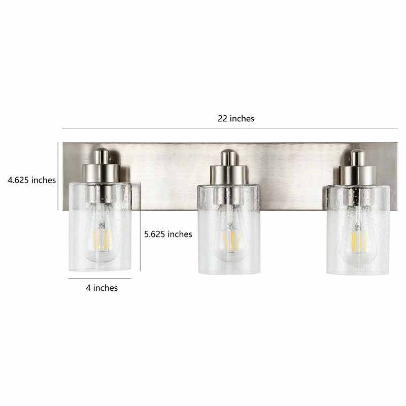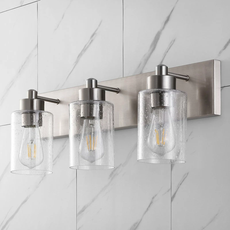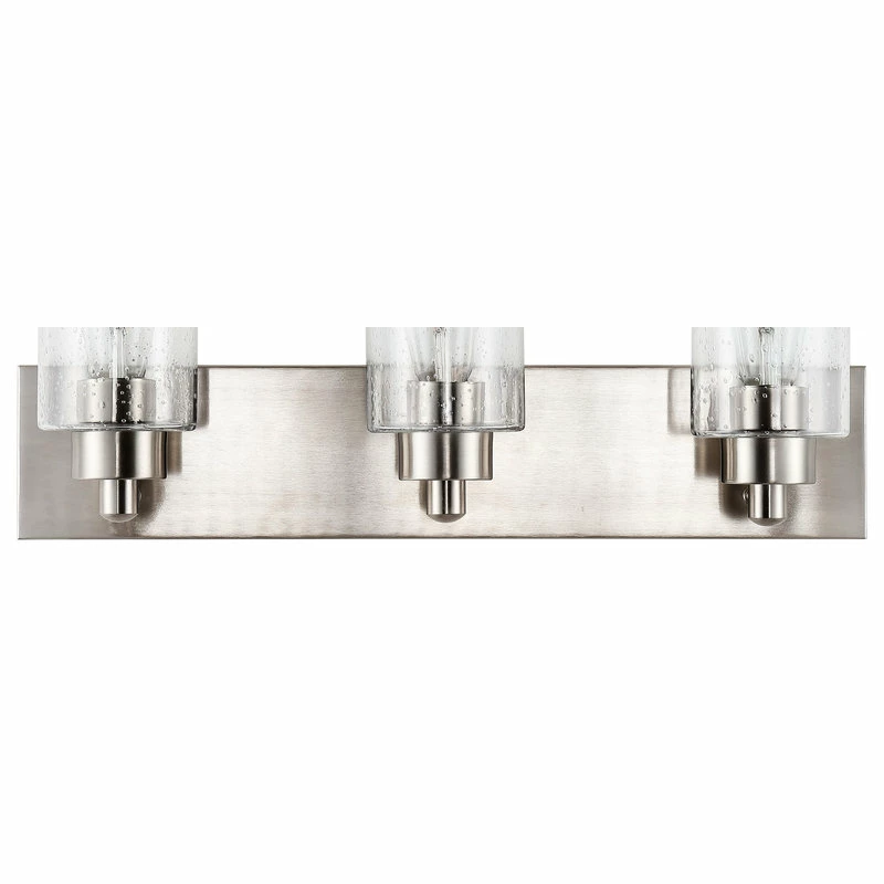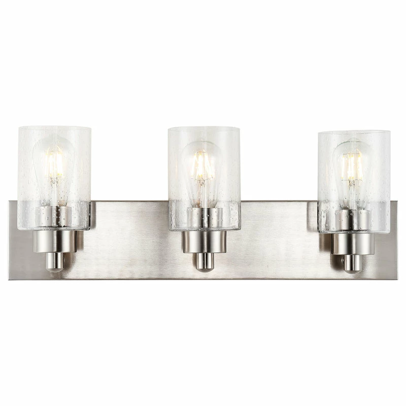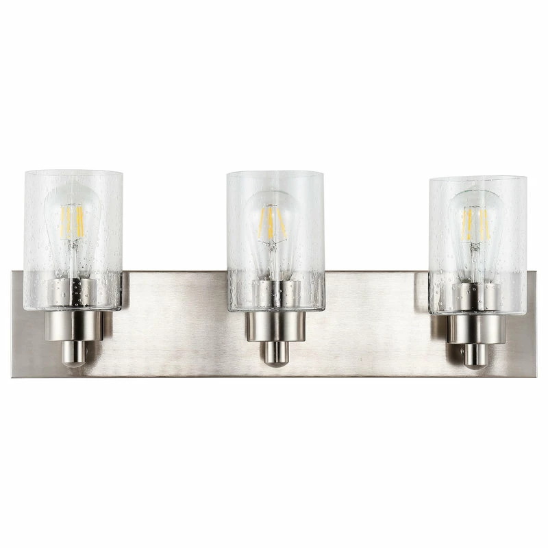 Elevate your bath vanity with our modern take on classic mid-century wall light. Three LED bulbs are included, casting a warm glow and providing plenty of light. The pewter-inspired nickel finish adds Art Deco sparkle, and clear bubble-glass shades add to the elegant vintage style. This vanity light can be installed either facing up or down.