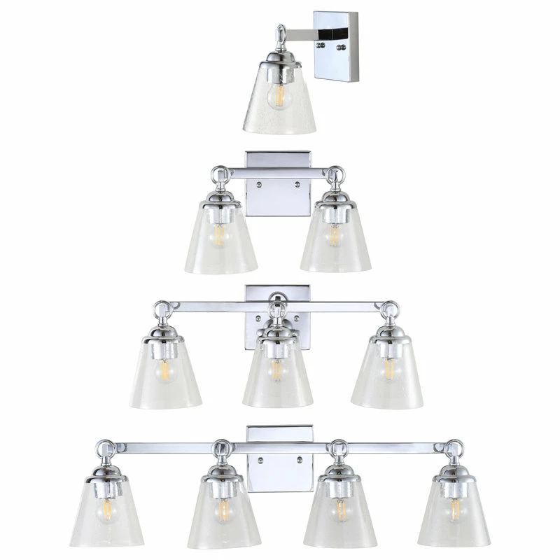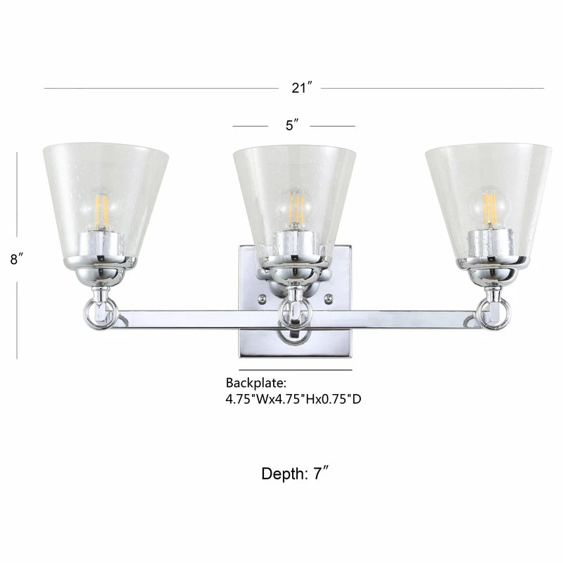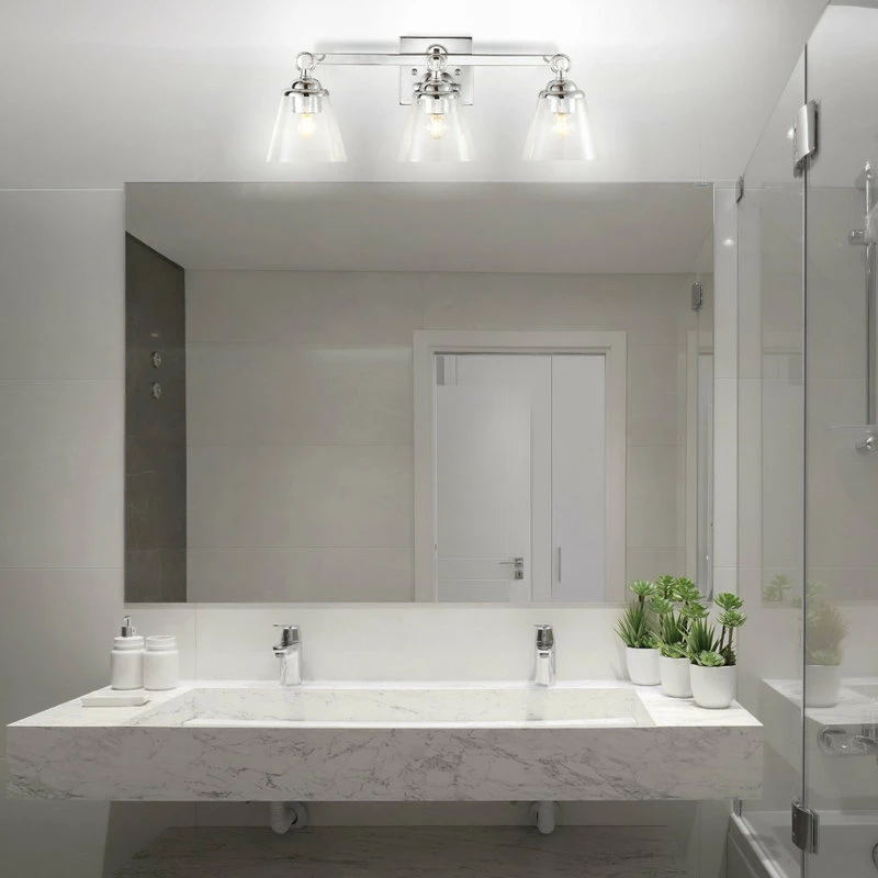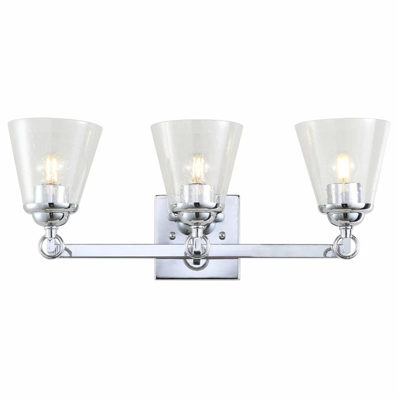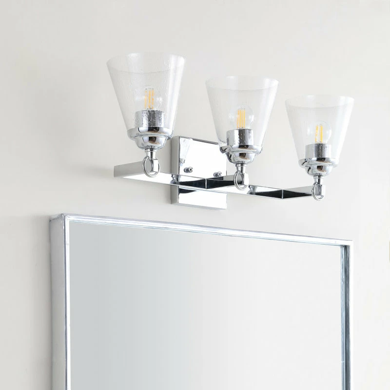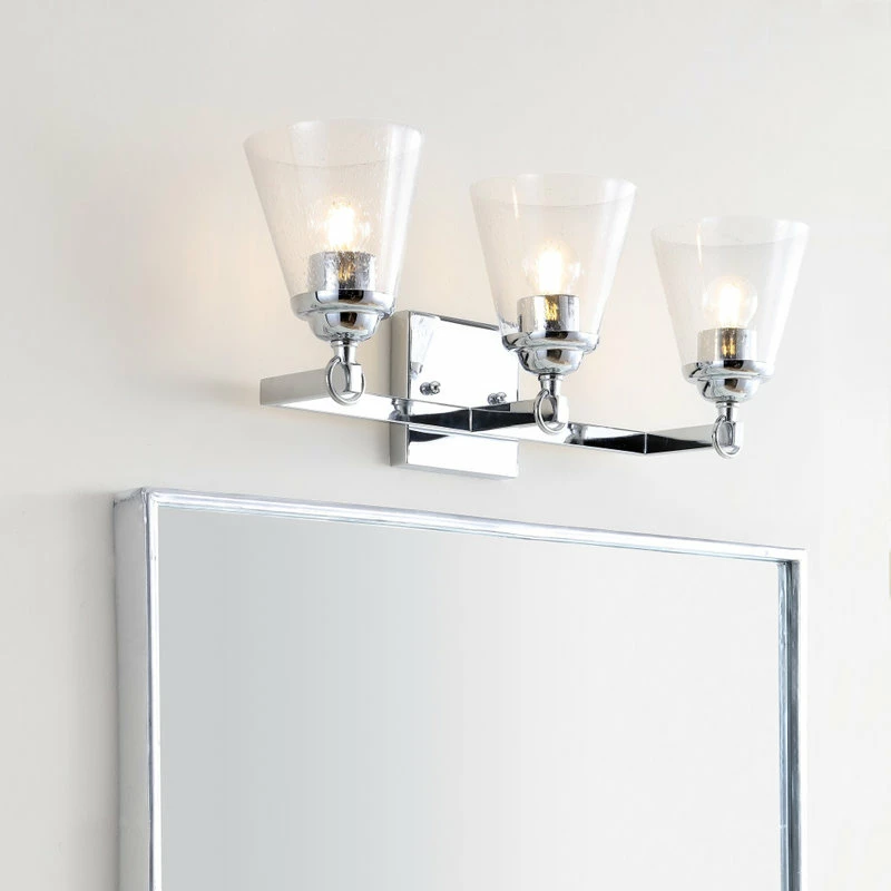 A beautiful upgrade for the vanity, this 3-light sconce delivers an elegant polished chrome frame finish. Three hurricane-style seedy glass shades offer detail and style, while allowing maximum light to illuminate your daily rituals. Also reversible, you can select to hang this light in either north-south orientation, creating versatility for any space.
