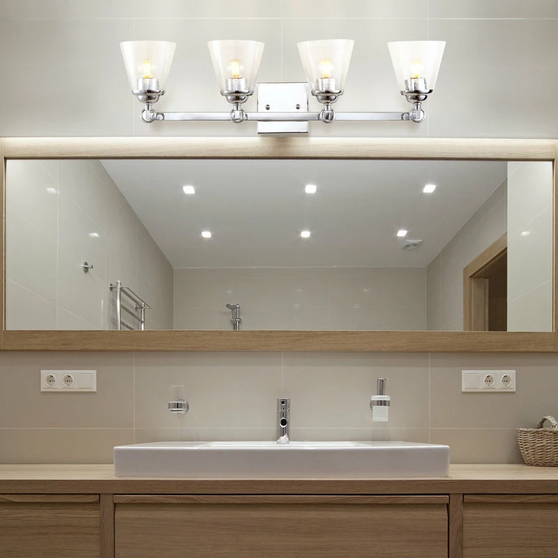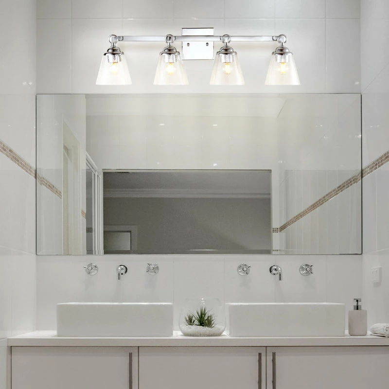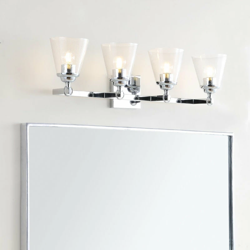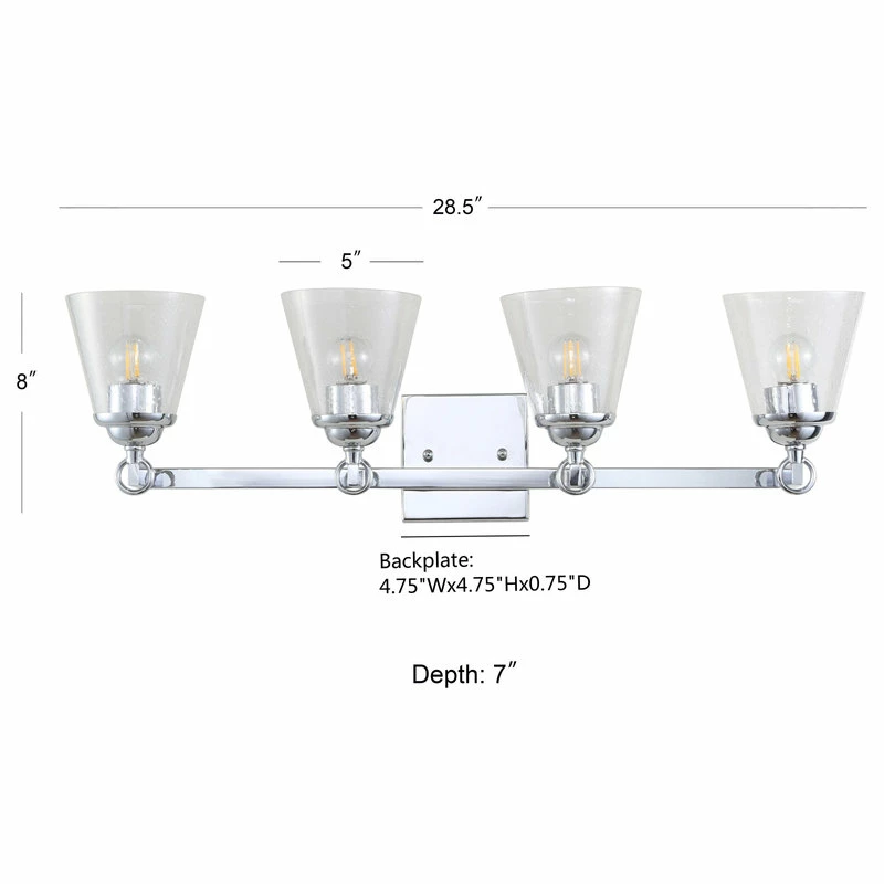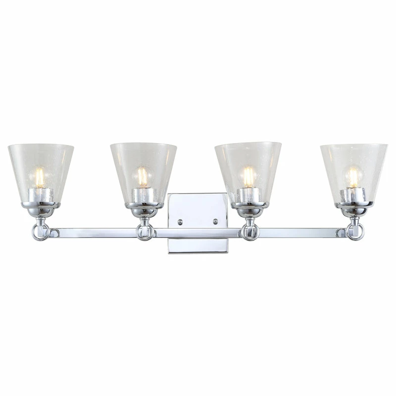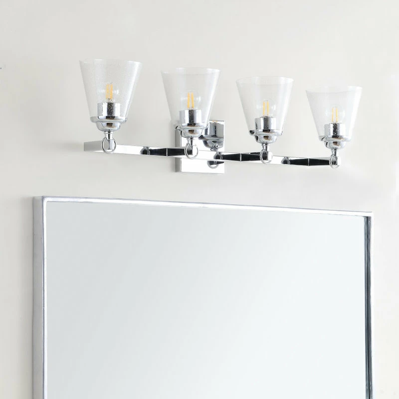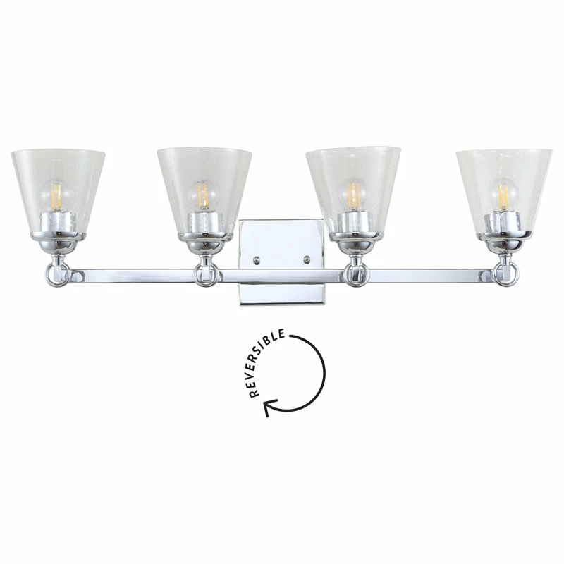 A beautiful upgrade for the vanity, this 4-light sconce delivers an elegant polished chrome frame finish. Four hurricane-style seedy glass shades offer detail and style, while allowing maximum light to illuminate your daily rituals. Also reversible, you can select to hang this light in either north-south orientation, creating versatility for any space.