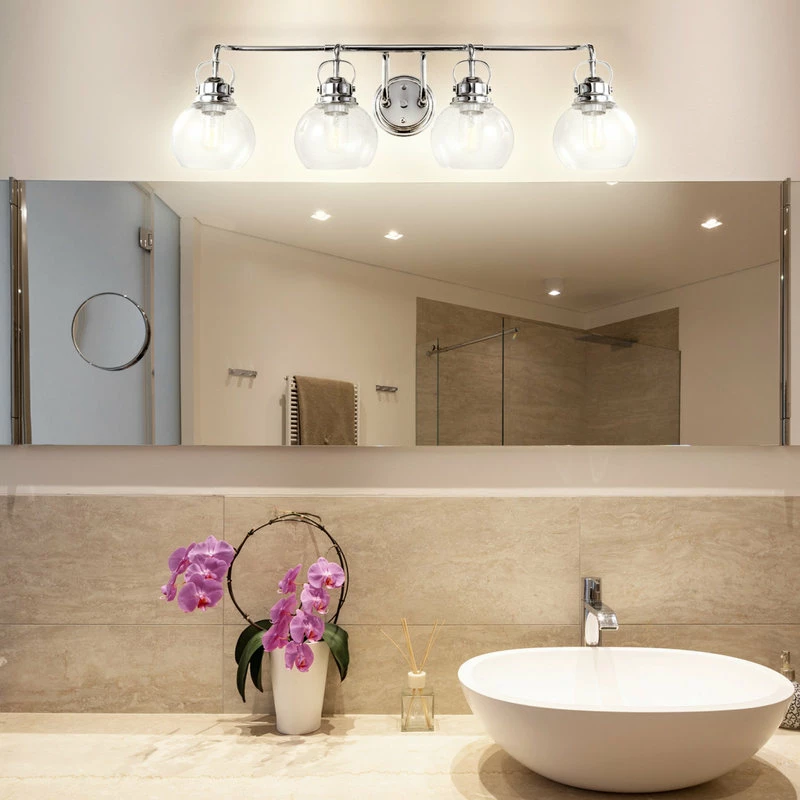- Hanging glass globes add classic style to this bathroom sconce