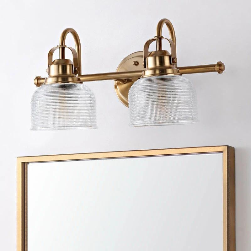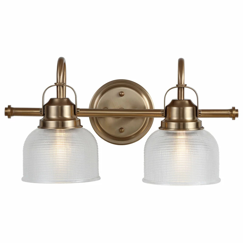 - Textured glass and brushed brass gold come together to create a chic, classic combination for this vanity light
