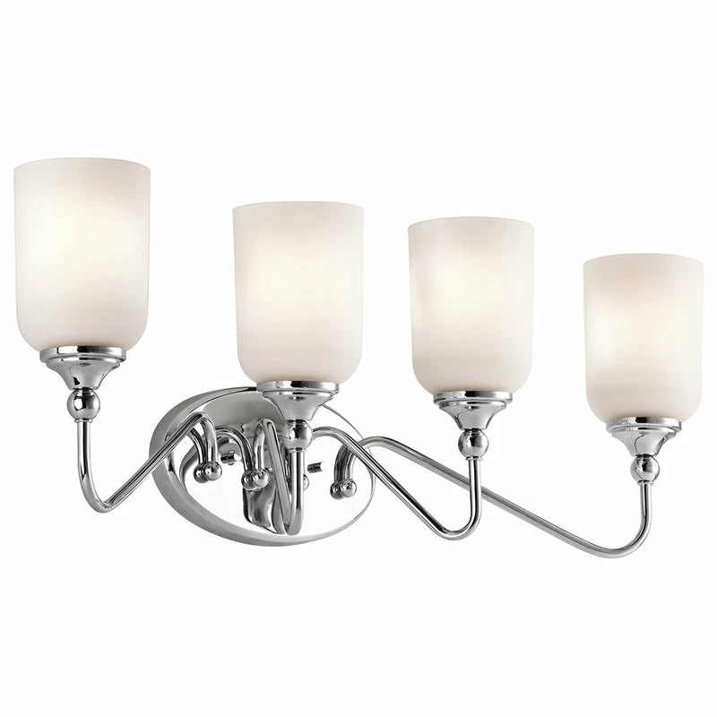 Graceful curving arms and warm Satin Etched White glass are the highlights of this chrome finish from the Lilah collection. The updated transitional styling will delight you for years to come. This light takes 4 x 100 Watt Bulbs **bulbs not included**UL approved. Hardwire installation