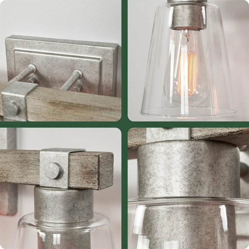 - MODERN FARMHOUSE DESIGN: Wall vanity light showcases a galvanized finish with complementing clear conic glass shades, fitting styles such as rustic & industrial. Bleached oak wood style linear bar adds extra wow factor and allows for up/down installation