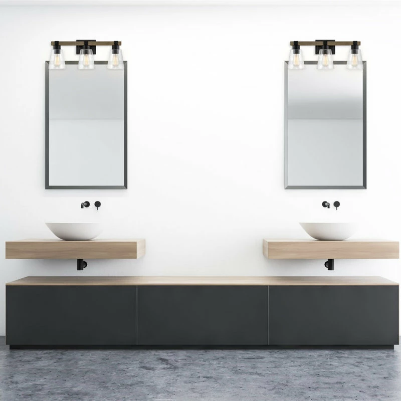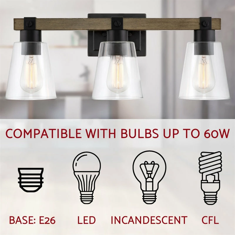 - MODERN FARMHOUSE DESIGN: Metal wall vanity light showcases a black finish with complementing clear conic glass shades, fitting styles such as rustic & industrial. Smoked birch wood style linear bar adds extra wow factor & allows for up/down installation