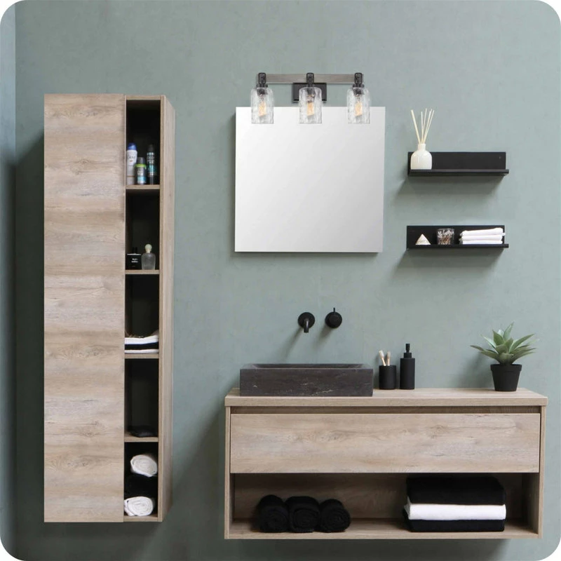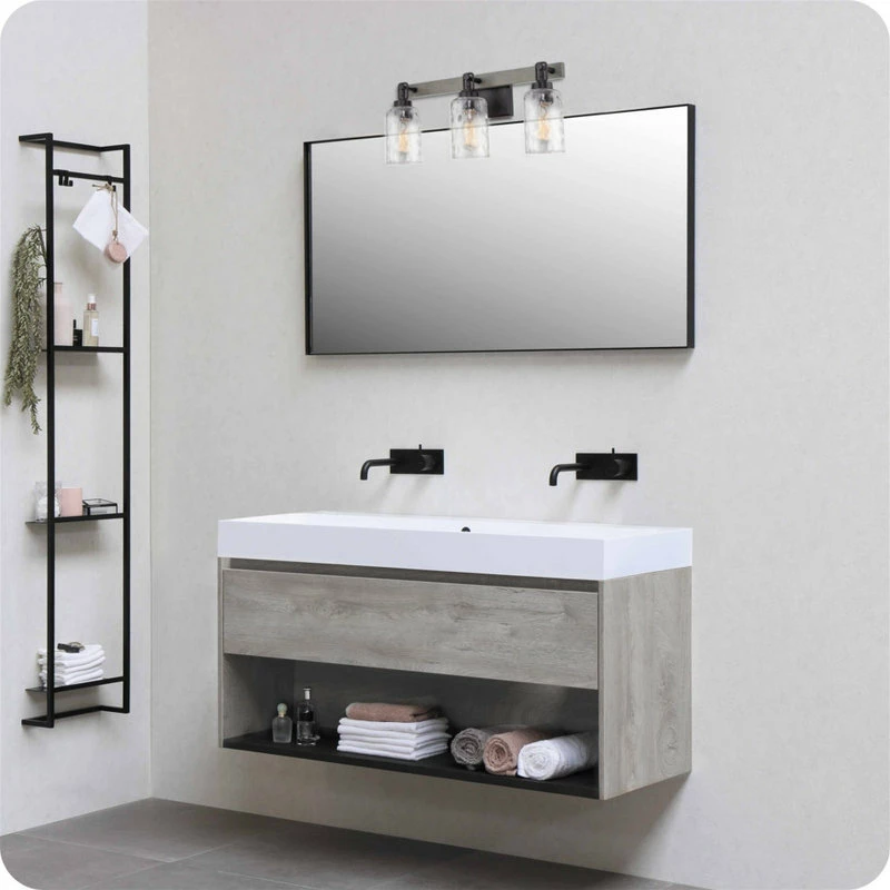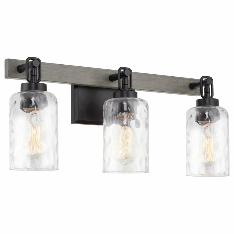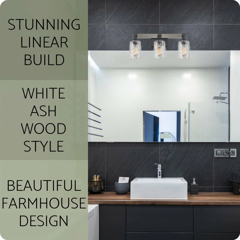 - MODERN FARMHOUSE DESIGN: Metal wall vanity light showcases a black finish with complementing clear hammered glass shades, fitting styles such as rustic & industrial. Gray oak wood style linear bar adds extra wow factor & allows for up/down installation