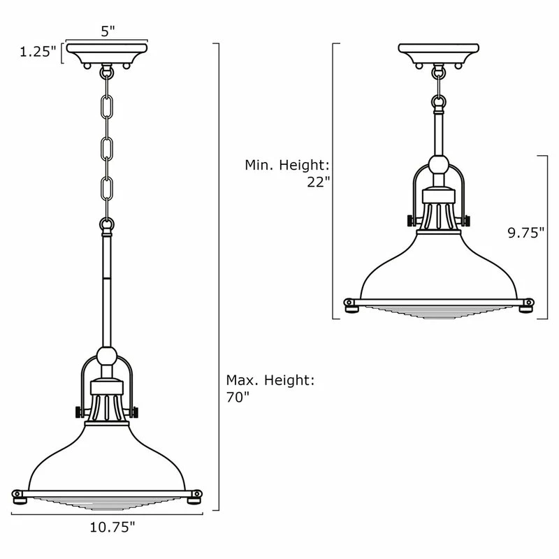 - DIMENSIONS: 9.75″ (H) x 10.75″ (D), Canopy: 5″ (D) x 1.25″ (H), Shade: 4.5″ (H) x 10.75″ (D). Includes (2) 6″ and (3) 12″ downrods for desired hanging height. Minimum/Maximum: 22″- 70″