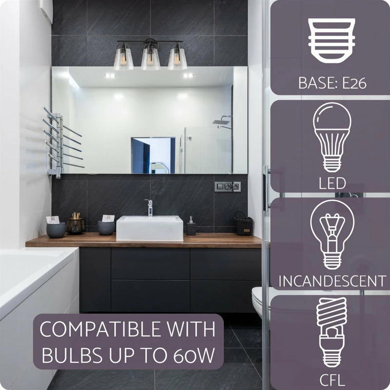 - LUXURIOUS FEEL: Gorgeous bathroom vanity features a minimal design with tapered seeded glass shades & black finish. This wall light makes a statement with its sleek curves. Easily install up or down. Fits styles like glam, rustic, farmhouse & traditional