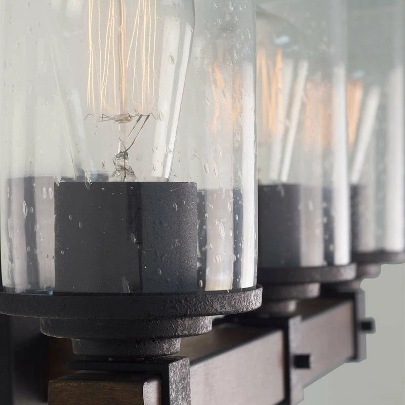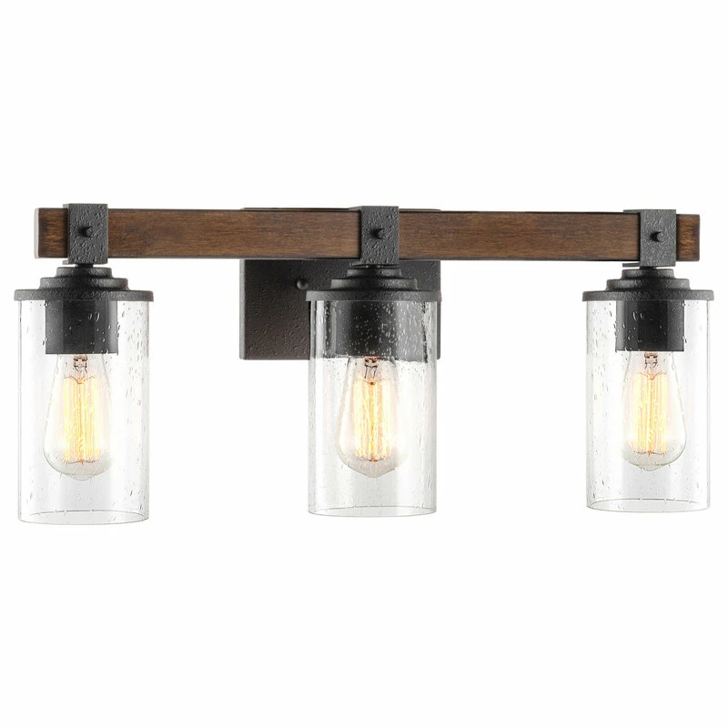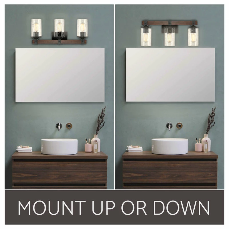- MODERN DESIGN: Metal wall vanity light showcases a textured black finish with complementing seeded glass shades suiting decors like rustic & farmhouse. The wood style linear bar in a walnut finish adds a wow factor and allows for up or down installation