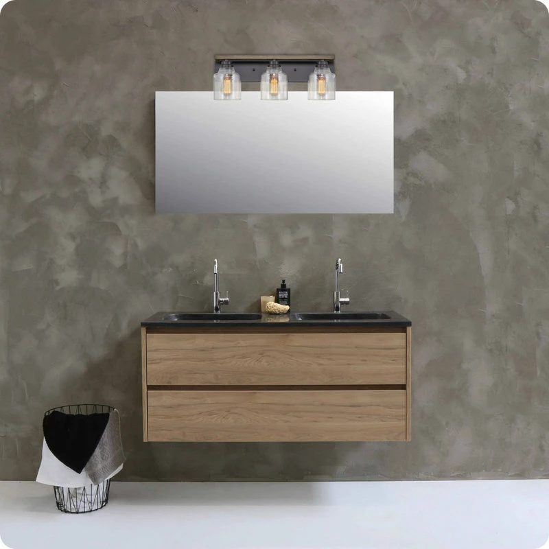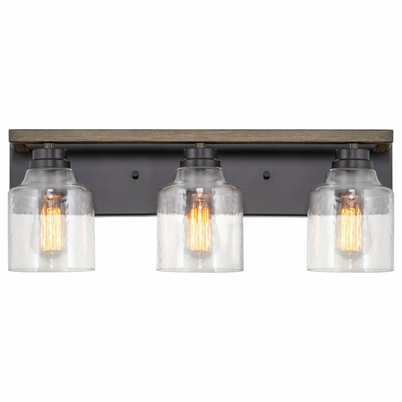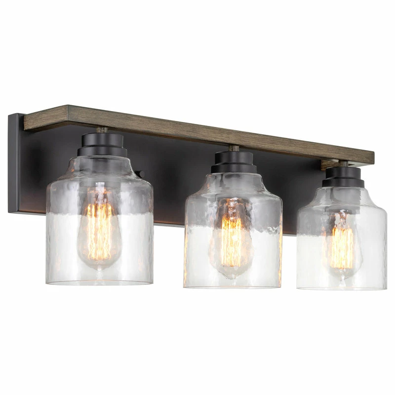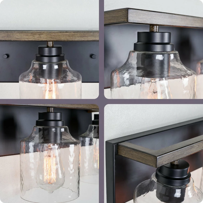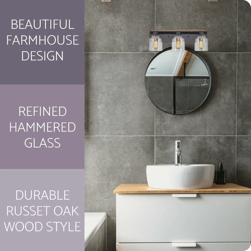 - MODERN FARMHOUSE DESIGN: Metal wall vanity light showcases a black finish with complementing clear hammered glass shades, fitting styles such as rustic & industrial. Russet oak wood style linear bar adds extra wow factor & allows for up/down installation