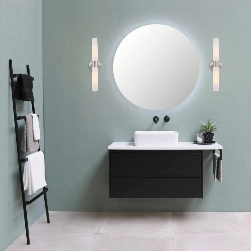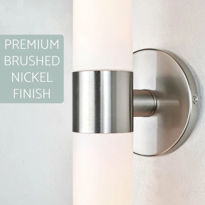 - MODERN DESIGN: Easy to install double light wall sconce features a stunning brushed nickel finish and tapered, open-end glass shades in a saber style. Makes for the perfect up and down bathroom light, illuminating in both directions. Vertical mount only