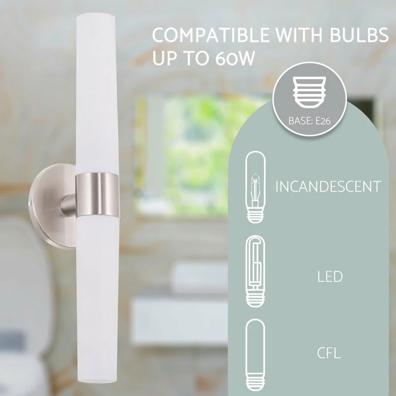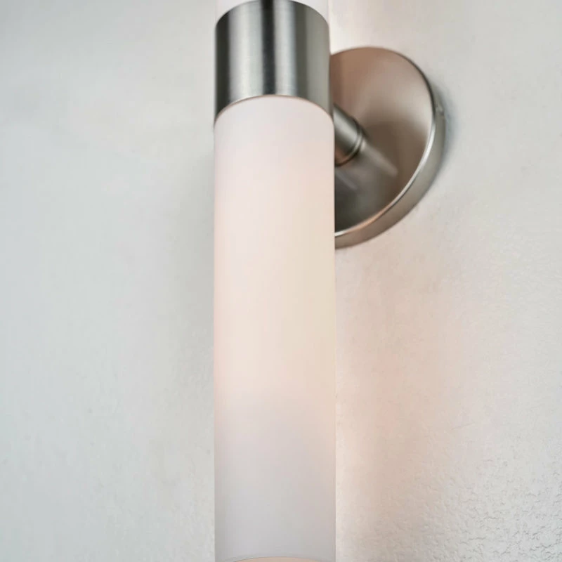 Indoor/Outdoor Usage: IndoorLighting Direction: Up/Down LightLighting Source Type: Incandescent, LED, CFLMounting Style: WallSafety Rating: UL ListedLocation Rating: DampShade Shape: CylinderShade Material: GlassFinish Type: BrushedRecommended Room Type: Indoor, Home, Bathroom, Living Room, Foyer, Hallway, Stairway, Office, Kitchen, Den, Study, BedroomSpecial Feature: Dimmer Compatible