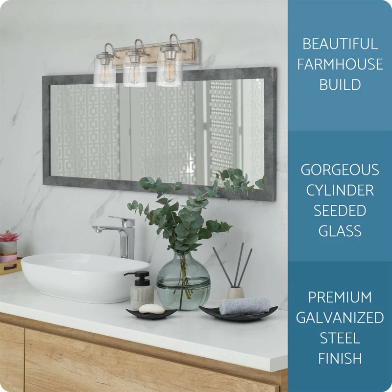 Kira Home’s Greyson 22″ 3-light vanity light brings an attractive industrial farmhouse feel to your home. Featuring a stunning metal wood style in white ash and galvanized finish and durable seeded glass cylinder shades, this wall fixture conveys both quality and character. Greyson is constructed with quality materials and has been designed with attention to detail and suits styles such as rustic and country decor well. Greyson is listed for damp locations, and can mount above the bathroom mirror or vanity in your powder room with the shades pointed in either and up or down direction. Illuminate covered outdoor spaces like porches and patios. Need to set the mood? Greyson works with standard dimmer switches when used with compatible bulbs, and if you’re looking for a vintage look and feel, choose bulbs with an Edison style. Unlike our low priced competitors, Greyson is ETL approved for your safety.