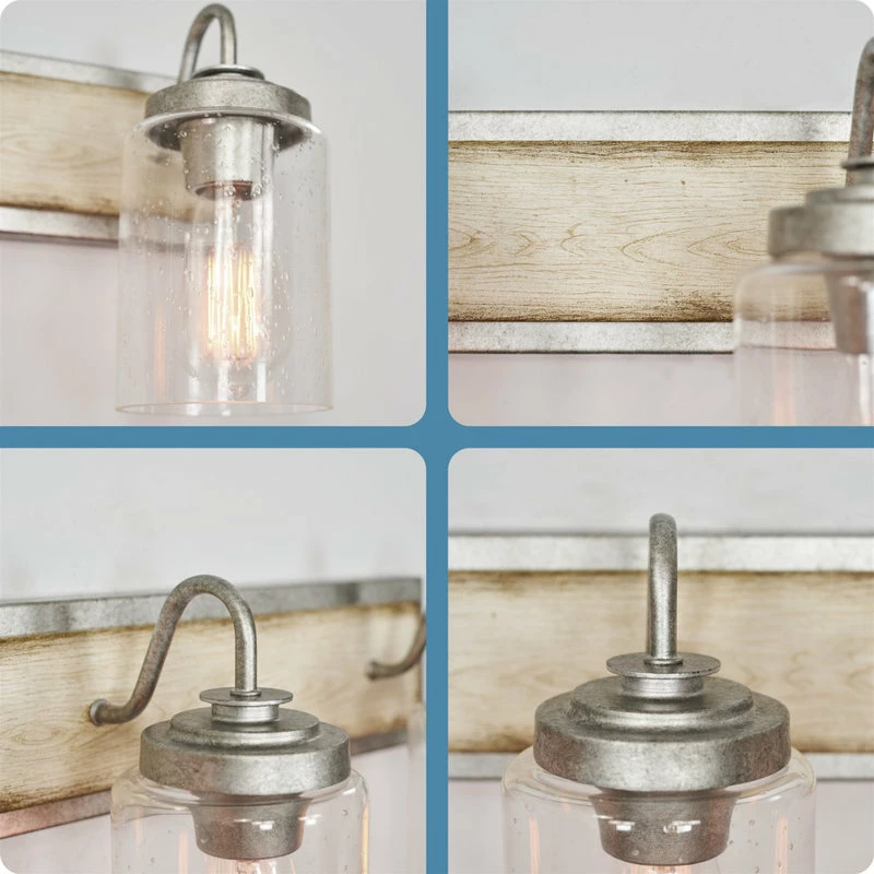 - MODERN FARMHOUSE DESIGN: Metal wall vanity light showcases a galvanized finish with complementing seeded glass shades, fitting styles such as rustic and industrial. White ash wood style linear bar adds extra wow factor and allows for up/down installation